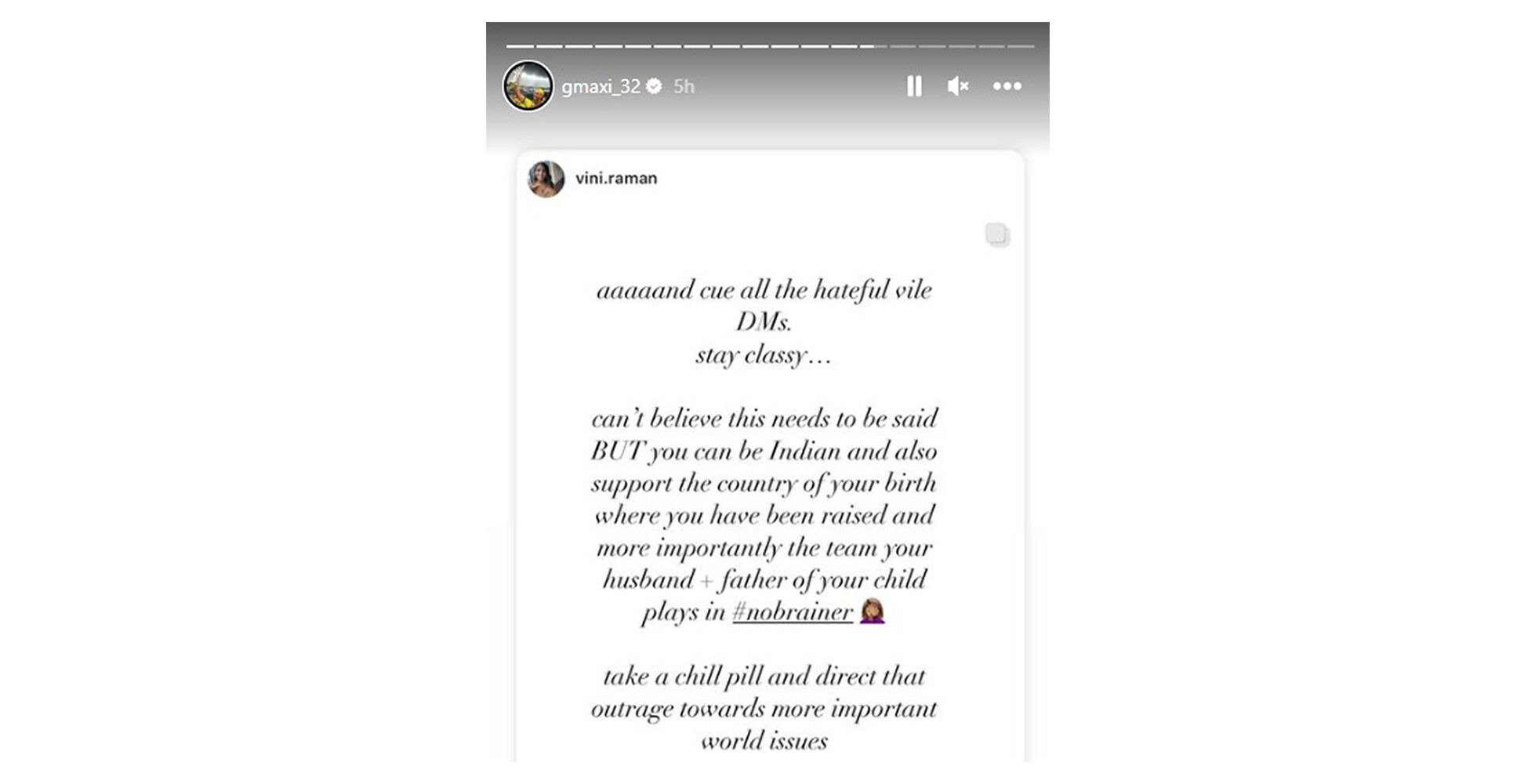 ದಕ್ಷಿಣ ಭಾರತ ಮೂಲದ ಮ್ಯಾಕ್ಸ್ವೆಲ್ ಅವರ ಪತ್ನಿ ವಿನಿ ರಾಮನ್, ಭಾರತೀಯರಾಗಿದ್ದರೂ ಆಸೀಸ್ಗೆ ಬೆಂಬಲ ನೀಡಿದ್ದಕ್ಕಾಗಿ ನಿಂದನೆ ಮತ್ತು ಬೆದರಿಕೆ ಎದುರಿಸಿದ್ದಾರೆ ಎಂದು ತಿಳಿದು ಬಂದಿದೆ. ʼಕೆಟ್ಟʼ ಅಭಿಮಾನಿಗಳಿಗೆ ಅವರು ತಮ್ಮ ಇನ್ಸ್ಟಾಗ್ರಾಮ್ ಪೋಸ್ಟ್ನಲ್ಲಿ ಪ್ರತ್ಯುತ್ತರ ನೀಡಿದ್ದಾರೆ.