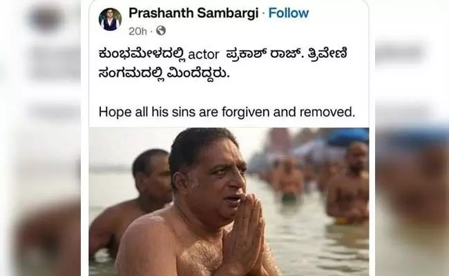 ನಟ ಪ್ರಕಾಶ್ ರಾಜ್ ಅವರು ನದಿಯಲ್ಲಿ ಸ್ನಾನ ಮಾಡಿ, ಕೈ ಮುಗಿಯುತ್ತಿರುವ AI ಚಿತ್ರವನ್ನು ಪ್ರಶಾಂತ್ ಸಂಬರಗಿ ಎಂಬ ಹೆಸರಿನ ಖಾತೆಯಿಂದ ಪೋಸ್ಟ್ ಮಾಡಲಾಗಿದ್ದು, ‘‘ಕುಂಭಮೇಳದಲ್ಲಿ ನಟ ಪ್ರಕಾಶ್ ರಾಜ್. ತ್ರಿವೇಣಿ ಸಂಗಮದಲ್ಲಿ ಮಿಂದೆದ್ದರು. ಅವರ ಪಾಪಗಳು ತೊಳೆದು ಹೋಗಲಿ ಎಂದು ಆಶಾಭಾವನೆ ವ್ಯಕ್ತಪಡಿಸೋಣ" ಎಂದು ಬರೆಯಲಾಗಿದೆ.