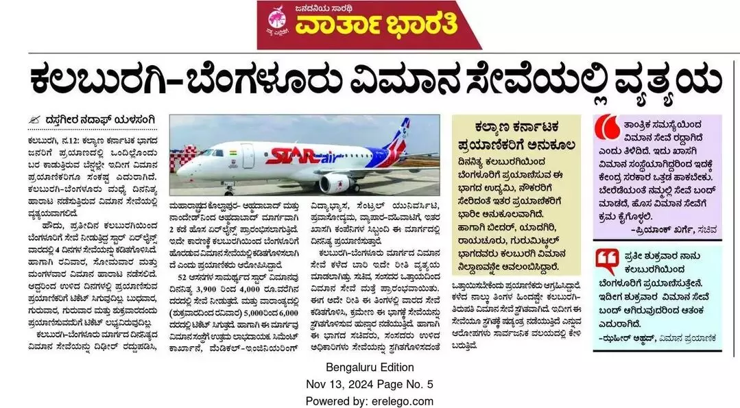 ಕಳೆದ ವರ್ಷ 2024ರ ನವೆಂಬರ್ 13 ರಂದು ಪತ್ರಿಕೆ ಲೇಖನ ಪ್ರಕಟಿಸಿತ್ತು. ಇದೀಗ ಬರೋಬ್ಬರಿ 5 ತಿಂಗಳ ಬಳಿಕ ವರದಿಯ ಫಲಶ್ರುತಿಯ ಕಾರಣ ಕಲಬುರಗಿಯಿಂದ ರಾಜಧಾನಿ ಬೆಂಗಳೂರಿಗೆ ವಿಮಾನ ಸೇವೆ ಆರಂಭವಾಗಲಿದೆ.