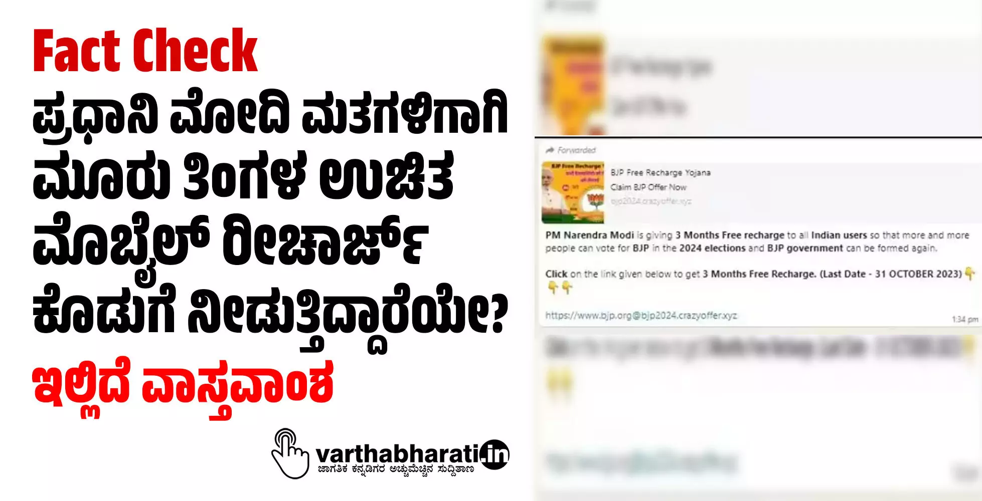 ಬಿಜೆಪಿ ಉಚಿತ ರೀಚಾರ್ಜ್ ಯೋಜನೆ: 2024ರ ಚುನಾವಣೆಯಲ್ಲಿ ಜನರು ಬಿಜೆಪಿಗೆ ಮತ ನೀಡಿ, ಮತ್ತೆ ಬಿಜೆಪಿ ಸರ್ಕಾರ ಅಸ್ತಿತ್ವಕ್ಕೆ ಬರಲಿ ಎಂದು ಪ್ರಧಾನಿ ನರೇಂದ್ರ ಮೋದಿ ಎಲ್ಲ ಭಾರತೀಯ ಬಳಕೆದಾರರಿಗೂ ಉಚಿತ ರೀಚಾರ್ಜ್ ಕೊಡುಗೆ ನೀಡುತ್ತಿದ್ದಾರೆ. ಮೂರು ತಿಂಗಳ ಉಚಿತ ರೀಚಾರ್ಜ್ ಕೊಡುಗೆಯನ್ನು ಪಡೆಯಲು ಕೆಳಗಿನ ಕೊಂಡಿಯ ಮೇಲೆ ಕ್ಲಿಕ್ಕಿಸಿ (ಕೊನೆಯ ದಿನಾಂಕ ಅಕ್ಟೋಬರ್ 31, 2023) ಎಂದು ಆ ಸಂದೇಶದಲ್ಲಿ ಹೇಳಲಾಗಿದೆ.