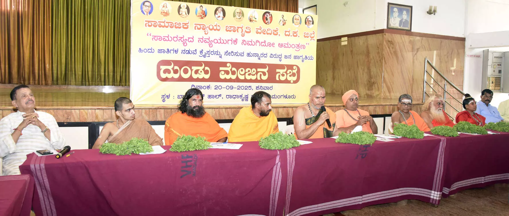 ಮಂಗಳೂರು: ಸಾಮಾಜಿಕ, ಶೈಕ್ಷಣಿಕ ಸಮೀಕ್ಷೆಯ ಪಟ್ಟಿಯಲ್ಲಿ ಹಿಂದೂ ಧರ್ಮದ 47 ಉಪಜಾತಿಗಳ ಜೊತೆ ಇರುವ ಕ್ರಿಶ್ಚಿಯನ್ ಪದವನ್ನು ಕೈಬಿಡದಿದ್ದರೆ ಸಮೀಕ್ಷೆಯನ್ನು ಬಹಿಷ್ಕರಿಸಲು ಸಾಮಾಜಿಕ ನ್ಯಾಯ ಜಾಗೃತಿ ವೇದಿಕೆಯ ದ.ಕ ಜಿಲ್ಲೆ ವತಿಯಿಂದ ನಗರದ ಬಾಳಂಭಟ್ ಸಭಾಂಗಣದಲ್ಲಿ ಶನಿವಾರ ನಡೆದ ಹಿಂದೂ ಧಾರ್ಮಿಕ ಪ್ರಮುಖರ, ಸಾಧು ಸಂತರ ದುಂಡುಮೇಜಿನ ಸಭೆ ನಿರ್ಣಯ ಕೈಗೊಂಡಿದೆ ಎಂದು ಗುರುಪುರ ವಜ್ರದೇಹಿ ಮಠದ ರಾಜಶೇಖರಾನಂದ ಸ್ವಾಮೀಜಿ ತಿಳಿಸಿದ್ದಾರೆ.