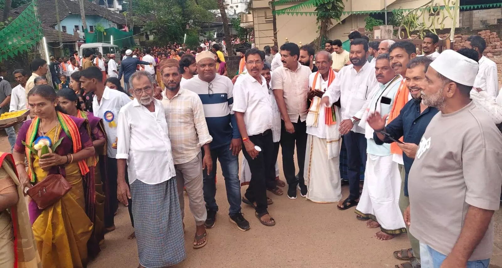 ಮಂಗಳೂರು, ಸೆ.23: ನಗರದ ಬಜಾಲ್ ನಂತೂರಿನ ಅಮೇವು ಶ್ರೀ ಆದಿಶಕ್ತಿ ದೇವಿ ದೇವಸ್ಥಾನದ ಪುನರ್ಪ್ರತಿಷ್ಠೆ ಕಲಶಾಭಿಷೇಕ ಪ್ರಯುಕ್ತ ಮಂಗಳವಾರ ಸಂಜೆ ನಡೆದ ಹೊರೆ ಕಾಣಿಕೆ ಮೆರವಣಿಗೆಯನ್ನು ಸ್ಥಳೀಯ ಮುಸ್ಲಿಮರು ಸ್ವಾಗತಿಸಿ ಗಮನ ಸೆಳೆದರು.