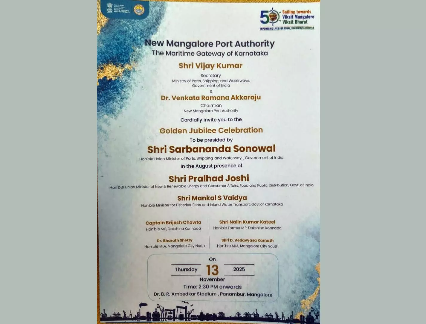 ಸುರತ್ಕಲ್: ನವ ಮಂಗಳೂರು ಬಂದರು ಪ್ರಾಧಿಕಾರ(ಎನ್.ಎಂ.ಪಿ.ಎ.)ದ ಸುವರ್ಣ ಮಹೋತ್ಸವ ಕಾರ್ಯಕ್ರಮ ನ.13ರಂದು ಪಣಂಬೂರು ಅಂಬೇಡ್ಕರ್ ಕ್ರೀಡಾಂಗಣದಲ್ಲಿ ನಡೆಯಲಿದ್ದು, ಇದರಲ್ಲಿ ಸರಕಾರಿ ಪ್ರೊಟೊಕಾಲ್ ಅನುಸರಿಸದೇ ಎನ್ ಎಂಪಿಎ ರಾಜಕೀಯ ಮಾಡುತ್ತಿದೆ ಎಂದು ಸುರತ್ಕಲ್ ಬ್ಲಾಕ್ ಕಾಂಗ್ರೆಸ್ ಆರೋಪಿಸಿದೆ.