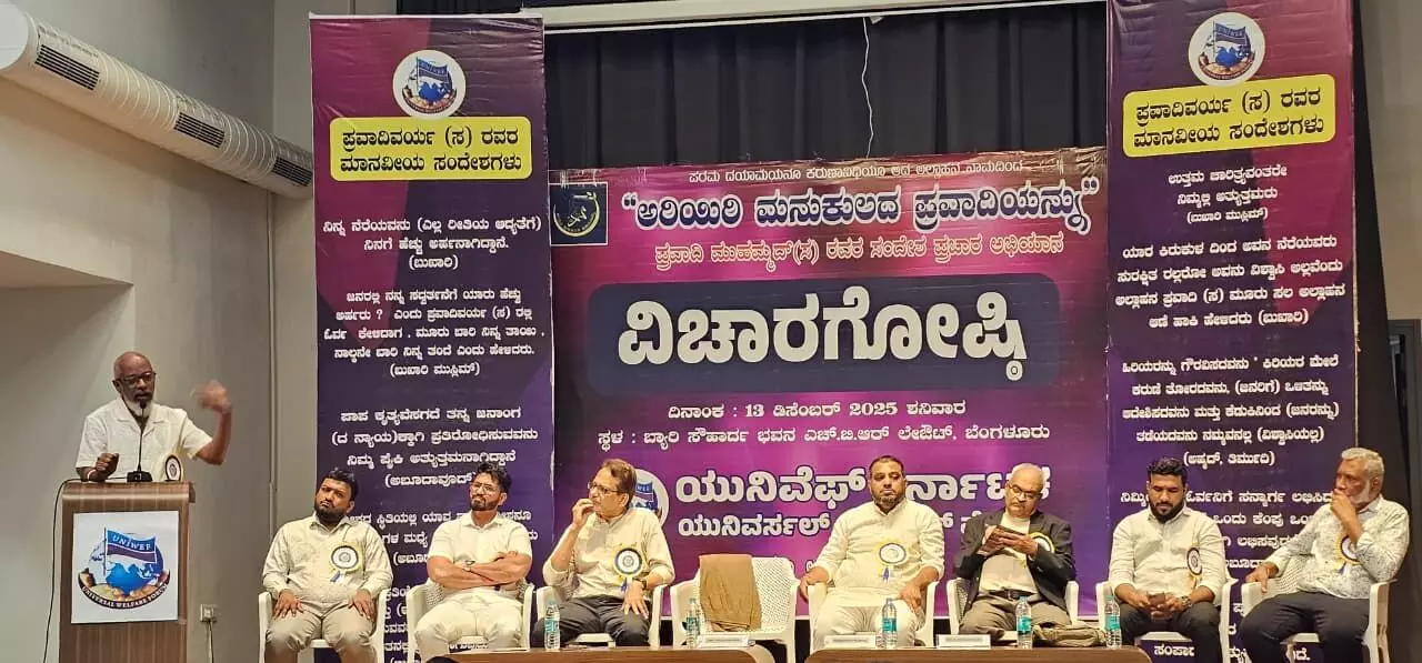 ಯುನಿವೆಫ್ ಕರ್ನಾಟಕ 2025ರ ಸೆಪ್ಟೆಂಬರ್ 19 ರಿಂದ 2 ಜನವರಿ 2026 ರ ವರೆಗೆ 100 ದಿನಗಳ ಕಾಲ ಹಮ್ಮಿಕೊಂಡಿರುವ 20 ನೇ ವರ್ಷದ ‘ಅರಿಯಿರಿ ಮನುಕುಲದ ಪ್ರವಾದಿಯನ್ನು’ ಅಭಿಯಾನದ ಪ್ರಯುಕ್ತ ಡಿ.13 ರಂದು ಬೆಂಗಳೂರಿನ ಬ್ಯಾರಿ ಸೌಹಾರ್ದ ಭವನದಲ್ಲಿ ‘ಶೋಷಿತ ಸಮಾಜ ಹಾಗೂ ಮಾನವ ಘನತೆ ಮತ್ತು ಪ್ರವಾದಿ ಮುಹಮ್ಮದ್ (ಸ)’ ಎಂಬ ವಿಷಯದಲ್ಲಿ ನಡೆದ ವಿಚಾರಗೋಷ್ಠಿಯಲ್ಲಿ ಮುಖ್ಯ ಅತಿಥಿಯಾಗಿ ಮಾತನಾಡಿದರು.