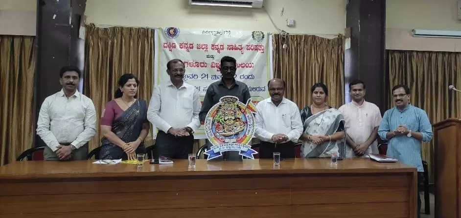 ದಕ್ಷಿಣ ಕನ್ನಡ ಜಿಲ್ಲಾ ಕನ್ನಡ ಸಾಹಿತ್ಯ ಪರಿಷತ್ತು ಮತ್ತು ಮಂಗಳೂರು ವಿಶ್ವವಿದ್ಯಾನಿಲಯದ ಇದರ ವತಿಯಿಂದ ಫೆ.21, 22 ರಂದು ಮಂಗಳೂರು ವಿವಿಯ ಮಂಗಳಾ ಸಭಾಂಗಣದಲ್ಲಿ ನಡೆಯುವ 27ನೇ ಜಿಲ್ಲಾ ಕನ್ನಡ ಸಾಹಿತ್ಯ ಸಾಹಿತ್ಯ ಸಮ್ಮೇಳನದ ಪೂರ್ವಭಾವಿ ಸಭೆಯಲ್ಲಿ ಸಮ್ನೇಳನದ ಲಾಂಛನವನ್ನು ಬಿಡುಗೊಳಿಸಿ ಅವರು ಮಾತನಾಡಿದರು.