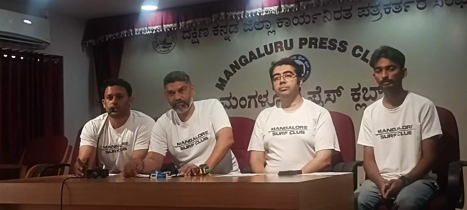 ಮಂಗಳೂರು ಸರ್ಫ್ ಕ್ಲಬ್ನ ಮಾಜಿ ಅಧ್ಯಕ್ಷ ಮಿಥುನ್ ಭಟ್, ನಿರ್ದೇಶಕ ರಿಷಭ್ರಾಜ್ ಶೆಟ್ಟಿ, ಕೋಸ್ಟ್ ಗಾರ್ಡ್ನ ಯಶ್ ಸಿನೋಯಾ ಸುದ್ದಿಗೋಷ್ಠಿಯಲ್ಲಿ ಉಪಸ್ಥಿತರಿದ್ದರು.