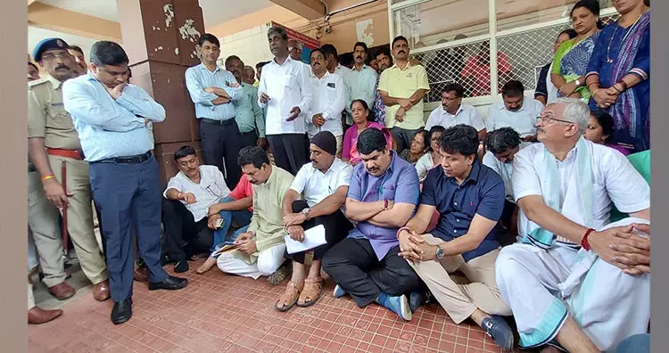 ಮಂಗಳೂರು, ಆ. 14: ದ.ಕ. ಜಿಲ್ಲೆಯಲ್ಲಿ ಬಿಜೆಪಿ ಶಾಸಕರ ಹಕ್ಕನ್ನು ಚ್ಯುತಿಗೊಳಿಸಲಾಗಿದೆ ಎಂದು ಆರೋಪಿಸಿ ಶಾಸಕರು, ಸಂಸದರು ಸೇರಿದಂತೆ ಜನಪ್ರತಿನಿಧಿಗಳು ಜಿಲ್ಲಾಧಿಕಾರಿ ಕಚೇರಿ ಕಟ್ಟಡದ ಮೆಟ್ಟಿಲಲ್ಲೇ ಪ್ರತಿಭಟನೆ ನಡೆಸಿದ ಘಟನೆ ಸೋಮವಾರ ನಡೆಯಿತು.