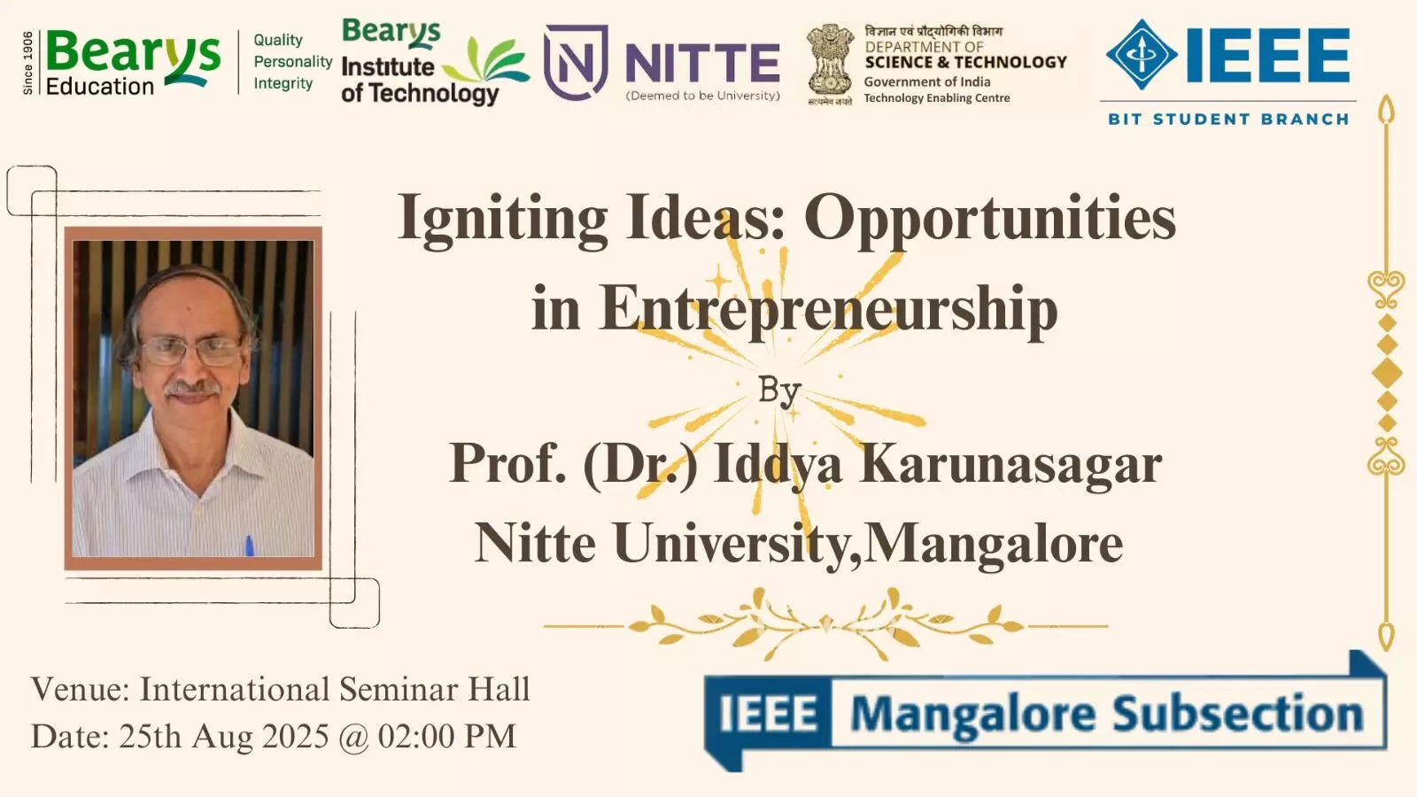 ಮಂಗಳೂರು: ಬ್ಯಾರೀಸ್ ಇನ್ಸ್ಟಿಟ್ಯೂಟ್ ಆಫ್ ಟೆಕ್ನಾಲಜಿ (ಬಿಐಟಿ)ಯ ಐಇಇಇ ವಿದ್ಯಾರ್ಥಿ ವಿಭಾಗ ಹಾಗೂ IEEE ಮಂಗಳೂರು ಉಪವಿಭಾಗದ ಸಹಯೋಗದಲ್ಲಿ “ಇಗ್ನೈಟಿಂಗ್ ಐಡಿಯಾಸ್: ಅಪಾರ್ಚುನಿಟೀಸ್ ಇನ್ ಆಂತ್ರೋಪ್ರಿನರ್ಶಿಪ್” ಎಂಬ ವಿಷಯದ ಕುರಿತಾಗಿ ಉಪನ್ಯಾಸವನ್ನು ಆ. 25ರಂದು ಬಿಐಟಿಯ ಅಂತರರಾಷ್ಟ್ರೀಯ ಸೆಮಿನಾರ್ ಹಾಲ್ನಲ್ಲಿ ಆಯೋಜಿಸಲಾಗಿತ್ತು.