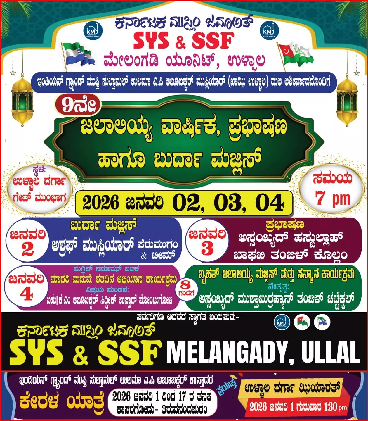 ಜ.2ರಂದು ಮಗ್ರಿಬ್ ನಮಾಝ್ನ ಬಳಿಕ ಅಶ್ರಫ್ ಮುಸ್ಲಿಯಾರ್ ಪೆರುಮುಗಂ ನೇತೃತ್ವದಲ್ಲಿ ಬೃಹತ್ ಬುರ್ದಾ ಮಜ್ಲಿಸ್ ನಡೆಯಲಿದೆ.