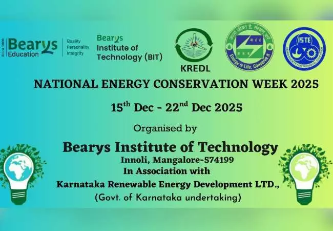 ಮಂಗಳೂರು: ಕರ್ನಾಟಕ ನವೀಕರಿಸಬಹುದಾದ ಇಂಧನ ಅಭಿವೃದ್ಧಿ ಲಿಮಿಟೆಡ್ (ಕೆಆರ್ಇಡಿಎಲ್) ಸಹಯೋಗದೊಂದಿಗೆ ಬ್ಯಾರೀಸ್ ಇನ್ಸ್ಟಿಟ್ಯೂಟ್ ಆಫ್ ಟೆಕ್ನಾಲಜಿ (ಬಿಐಟಿ)ಯಲ್ಲಿ ʼರಾಷ್ಟ್ರೀಯ ಇಂಧನ ಸಂರಕ್ಷಣಾ ಸಪ್ತಾಹʼ ಡಿಸೆಂಬರ್ 15ರಿಂದ ವಿವಿಧ ಜಾಗೃತಿ ಹಾಗೂ ವಿದ್ಯಾರ್ಥಿ ಕೇಂದ್ರಿತ ಕಾರ್ಯಕ್ರಮಗಳೊಂದಿಗೆ ಯಶಸ್ವಿಯಾಗಿ ಆರಂಭವಾಯಿತು.