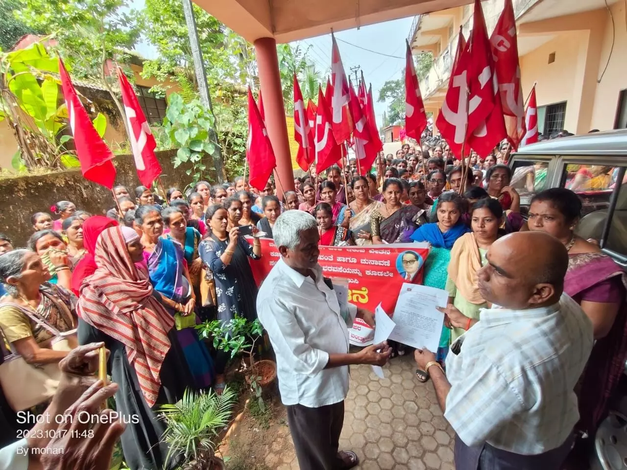 ಧರಣಿಯನ್ನುದ್ದೇಶಿಸಿ ಎಐಸಿಸಿಟಿಯು ಜಿಲ್ಲಾ ಅಧ್ಯಕ್ಷ ರಾಮಣ್ಣ ವಿಟ್ಲ ಮಾತನಾಡಿ, ಅಕ್ಷರ ದಾಸೋಹ ನೌಕರರು ಕಳೆದ ಇಪ್ಪತ್ತು ವರ್ಷಗಳಿಂದ ಕಡಿಮೆ ವೇತನದಲ್ಲಿ ದುಡಿಯುತ್ತಿದ್ದು, 3 ತಿಂಗಳಿಂದ ಸಂಬಳ ನೀಡದೆ ಸತಾಯಿಸಲಾಗುತ್ತಿದೆ ಎಂದು ಆರೋಪಿಸಿದ ಅವರು ಚುನಾವಣೆ ಸಂದರ್ಭದಲ್ಲಿ ಸಂಬಳ ಏರಿಕೆ ಮಾಡುವುದಾಗಿ ಭರವಸೆ ನೀಡಿದ್ದು ಸರಕಾರವು ಈವರೆಗೆ ಏರಿಕೆ ಮಾಡಿರುವುದಿಲ್ಲ ಕೂಡಲೇ ವೇತನ ಏರಿಕೆ ಮಾಡದಿದ್ದಲ್ಲಿ ಅ.30ರಿಂದ ಅನಿರ್ದಿಷ್ಟಾವಧಿ ಧರಣಿ ನಡೆಸಲಾಗುವುದು ಎಂದು ಎಚ್ಚರಿಸಿದರು.