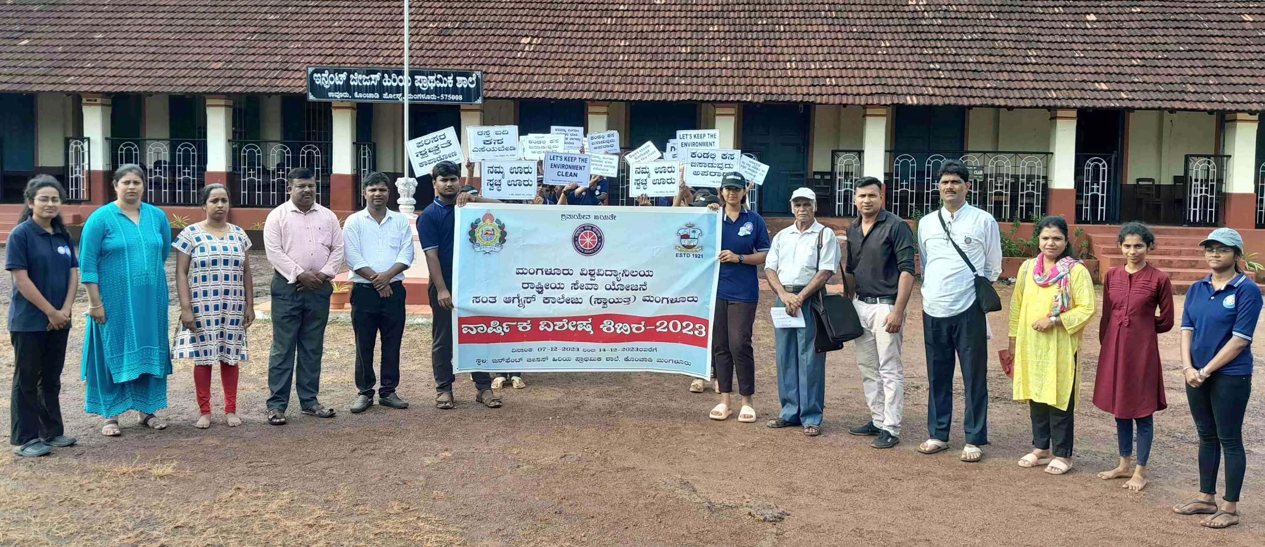 ಮಂಗಳೂರು: ಮಂಗಳೂರು ವಿವಿ ರಾಷ್ಟ್ರೀಯ ಸೇವಾ ಯೋಜನೆ, ಸಂತ ಆಗ್ನೇಸ್ ಕಾಲೇಜು (ಸ್ವಾಯತ್ತ) ಮಂಗಳೂರು ಇದರ ವಾರ್ಷಿಕ ವಿಶೇಷ ಶಿಬಿರವು ನಗರದ ಮೇರಿಹಿಲ್ ಇನ್ಫೆಂಟ್ ಜೀಸಸ್ ಹಿ.ಪ್ರಾ.ಶಾಲೆಯಲ್ಲಿ ನಡೆಯುತ್ತಿದ್ದು, ರವಿವಾರ ಪರಿಸರ ಜಾಗೃತಿ ಜಾಥಾ ಮತ್ತು ಬೀದಿ ನಾಟಕ ನಡೆಯಿತು.