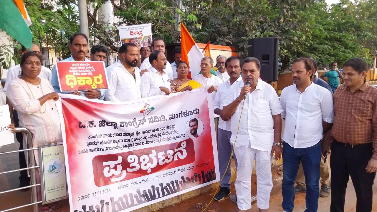 ಮಂಗಳೂರು: ಎಐಸಿಸಿ ಮುಖಂಡ ರಾಹುಲ್ ಗಾಂಧಿ ನೇತೃತ್ವದಲ್ಲಿ ನಡೆಯುವ ‘ಭಾರತ್ ಜೋಡೊ ನ್ಯಾಯ ಯಾತ್ರೆ’ಗೆ ಅಡ್ಡಿಪಡಿಸಿದ ಅಸ್ಸಾಂ ಸರಕಾರ ಪ್ರೇರಿತ ಬಿಜೆಪಿ ಕಾರ್ಯಕರ್ತರ ಕೃತ್ಯವನ್ನು ಖಂಡಿಸಿ ದ.ಕ.ಜಿಲ್ಲಾ ಕಾಂಗ್ರೆಸ್ ವತಿಯಿಂದ ಮಂಗಳವಾರ ನಗರದ ಮಿನಿ ವಿಧಾನಸೌಧದ ಮುಂದೆ ಪ್ರತಿಭಟನೆ ನಡೆಸಲಾಯಿತು.
