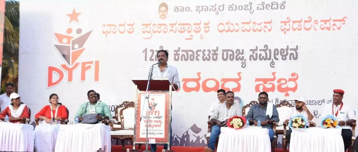 ತೊಕ್ಕೊಟ್ಟಿನ ಯುನಿಟಿ ಮೈದಾನದ ಶ್ರೀನಿವಾಸ್ ಬಜಾಲ್ ನಗರದ ಭಾಸ್ಕರ ಕುಂಬ್ಳೆ ವೇದಿಕೆಯಲ್ಲಿ ಮಂಗಳವಾರ ಡಿವೈಎಫ್ಐನ 12ನೆ ರಾಜ್ಯ ಸಮ್ಮೇಳನದ ಸಮಾರೋಪ ಸಮಾರಂಭದ ಅಂಗವಾಗಿ ಬಹಿರಂಗ ಸಭೆಯನ್ನು ಉದ್ದೇಶಿಸಿ ಅವರು ಮಾತನಾಡಿದರು.