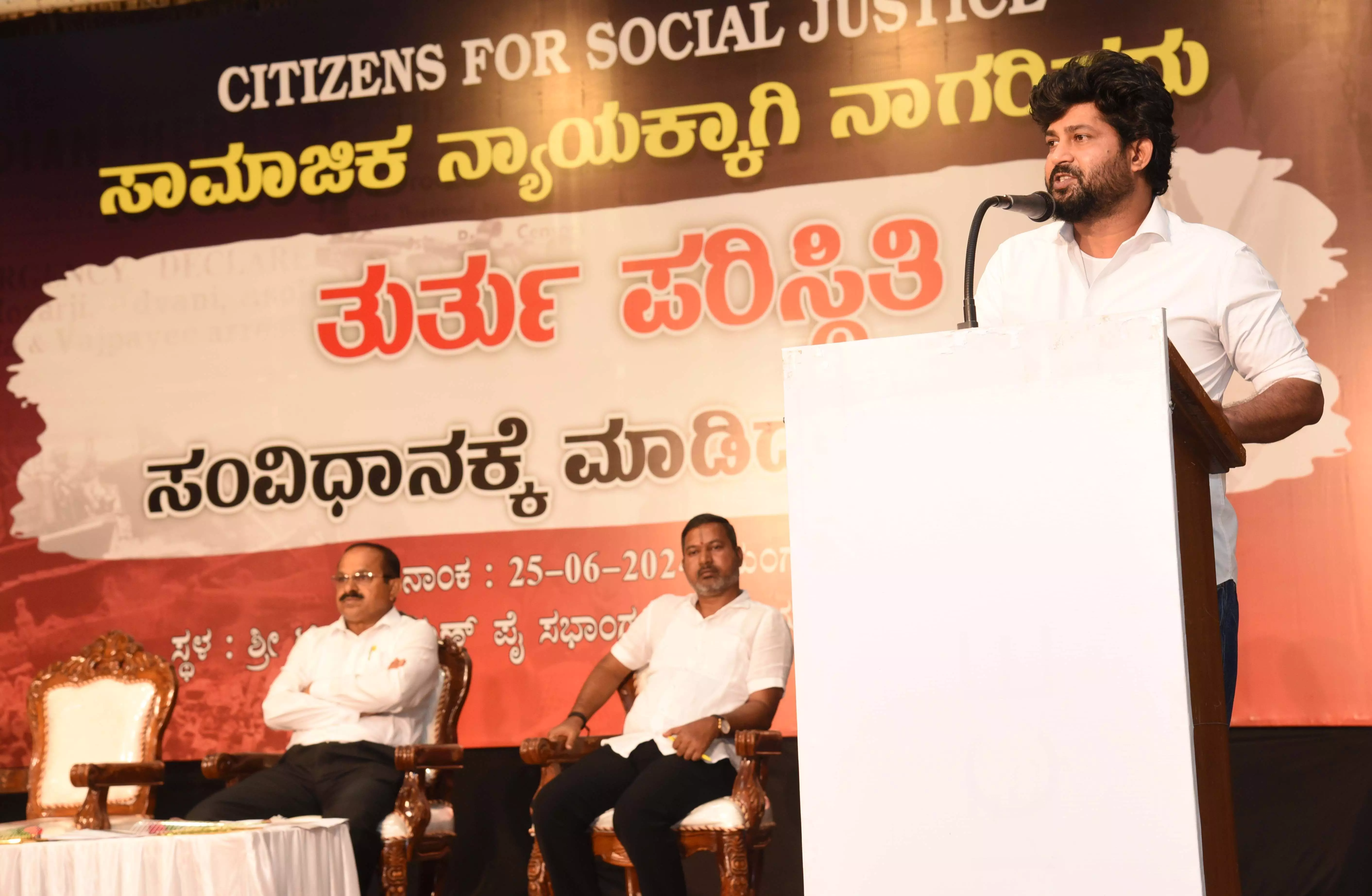 ಮಾಜಿ ಸಂಸದ ಪ್ರತಾಪ ಸಿಂಹ ಮಾತನಾಡಿ ಡಾ. ಬಿ.ಆರ್. ಅಂಬೇಡ್ಕರ್ ರಚಿಸಿದ ಸಂವಿಧಾನದವನ್ನು ಬದಲಾಯಿಸಿದ್ದೇ ಕಾಂಗ್ರೆಸ್. 50 ವರ್ಷದ ಹಿಂದೆ ತುರ್ತು ಪರಿಸ್ಥಿತಿ ಹೇರಿಕೆ ಹಾಗೂ ತಿದ್ದುಪಡಿ ಮೂಲಕ ಸಂವಿಧಾನವನ್ನು ಬುಡಮೇಲು ಮಾಡಿರುವುದು ಇಂದಿರಾ ಗಾಂಧಿ. ಕಾಂಗ್ರೆಸ್ನಂತೆ ಸಂವಿಧಾನವನ್ನು ಬುಡಮೇಲು ಮಾಡಲು ಯಾರಿಂದಲೂ ಸಾಧ್ಯ ವಿಲ್ಲ. ತುರ್ತು ಪರಿಸ್ಥಿತಿ ವಿರುದ್ಧ ಹೋರಾಟ ನಡೆಸಿದವರಿಗೆ ಮುಂದಿನ ದಿನಗಳಲ್ಲಿ ಪಿಂಚಣಿ ನೀಡುವ ಬಿಜೆಪಿಯ ಭರವಸೆಗೆ ಬದ್ಧರಾಗಿದ್ದೇವೆ ಎಂದರು.