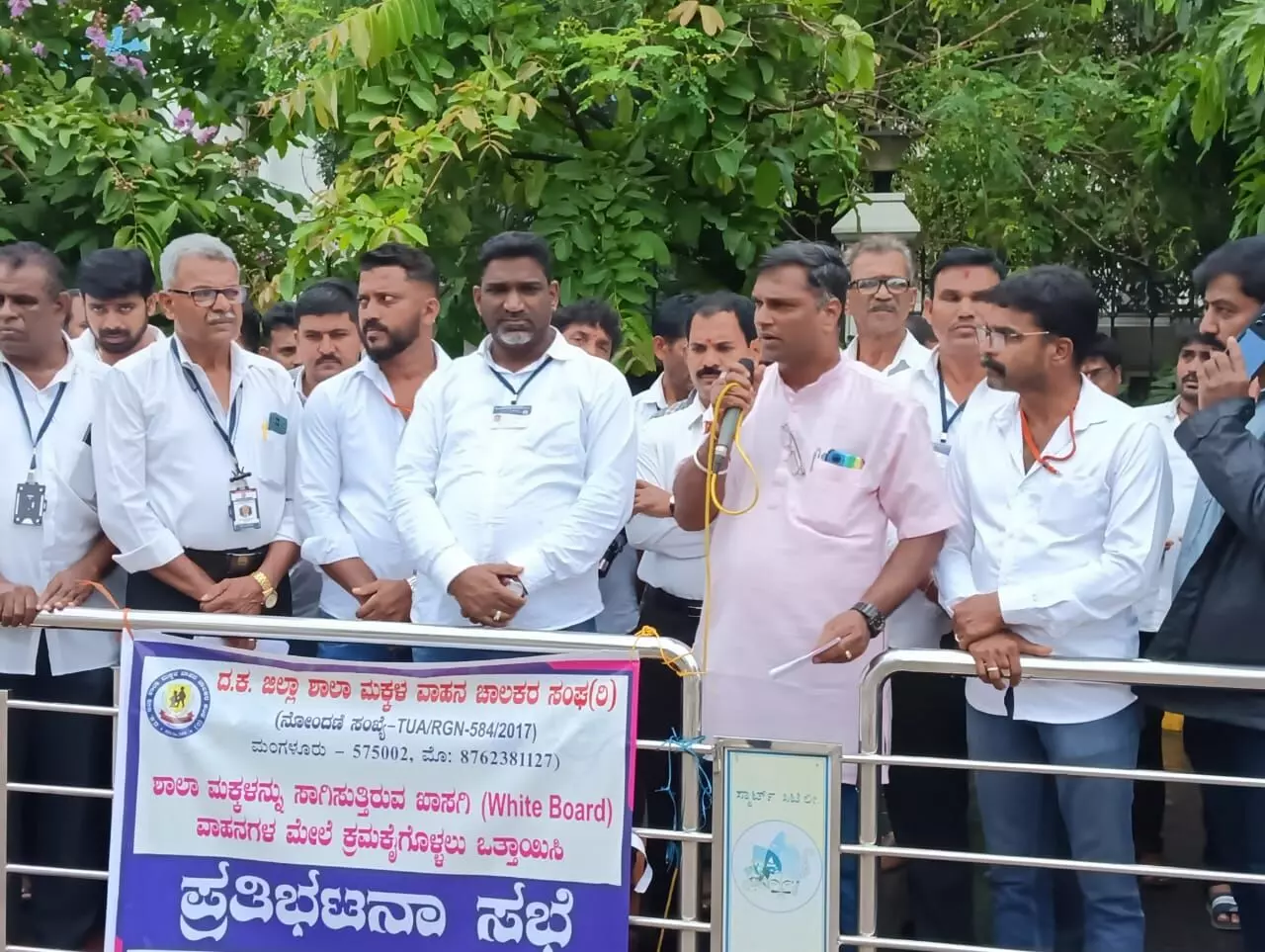 ಮಂಗಳೂರು: ಶಾಲಾ ಮಕ್ಕಳನ್ನು ಸಾಗಿಸುತ್ತಿರುವ ಖಾಸಗಿ ವಾಹನ (ವೈಟ್ ಬೋರ್ಡ್)ಗಳ ವಿರುದ್ಧ ಕಟ್ಟುನಿಟ್ಟಿನ ಕ್ರಮ ಕೈಗೊಳ್ಳಲು ಒತ್ತಾಯಿಸಿ ದ.ಕ.ಜಿಲ್ಲಾ ಶಾಲಾ ಮಕ್ಕಳ ವಾಹನ ಚಾಲಕರ ಸಂಘದ ನೇತೃತ್ವದಲ್ಲಿ ವಾಹನ ಚಾಲಕರು ನಗರದ ಕ್ಲಾಕ್ ಟವರ್ ಬಳಿ ಗುರುವಾರ ಧರಣಿ ನಡೆಸಿದರು.