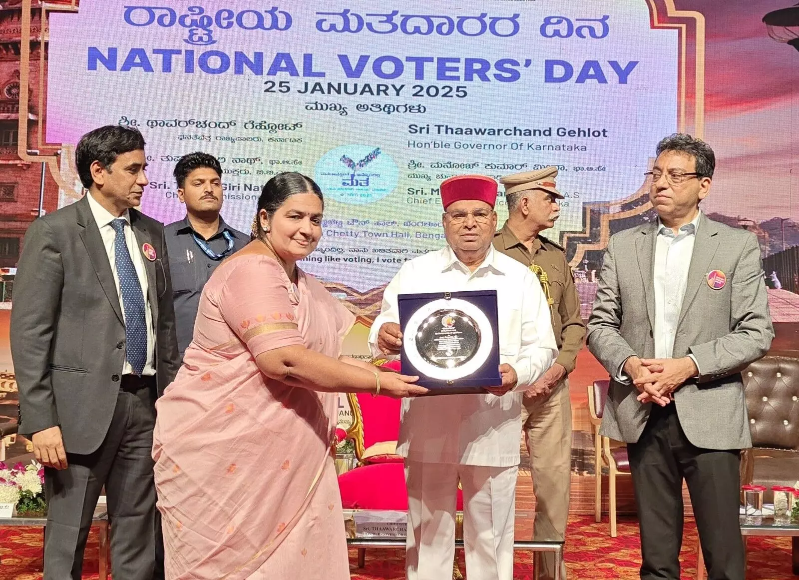 ಮಂಗಳೂರು, ಜ.25: ಬೆಂಗಳೂರಿನ ಪುಟ್ಟಣ್ಣ ಚೆಟ್ಟಿ ಟೌನ್ ಹಾಲ್ನಲ್ಲಿ ಕರ್ನಾಟಕ ಮುಖ್ಯ ಚುನಾವಣಾಧಿಕಾರಿ ಆಯೋಜಿಸಿದ್ದ ರಾಷ್ಟ್ರೀಯ ಮತದಾರರ ದಿನಾಚರಣೆಯ ಸಂದರ್ಭದಲ್ಲಿ ರಾಜ್ಯಪಾಲ ಥಾವರ್ಚಂದ್ ಗೆಹ್ಲೋಟ್ ಅವರು ರಾಜ್ಯ ಮಟ್ಟದ ಮಾಸ್ಟರ್ ಟ್ರೈನರ್ (ಎಸ್ಎಲ್ಎಂಟಿ ) ಪ್ರಮೀಳಾ ರಾವ್ ಅವರಿಗೆ ಕಳೆದ ಲೋಕಸಭಾ ಚುನಾವಣೆಯ ಅತ್ಯುತ್ತಮ ಕಾರ್ಯನಿರ್ವಹಣೆಗಾಗಿ ಕರ್ನಾಟಕ ರಾಜ್ಯಪಾಲ ಥಾವರ್ಚಂದ್ ಗೆಹ್ಲೋಟ್ ಅವರು ಶನಿವಾರ ರಾಜ್ಯ ಪ್ರಶಸ್ತಿಯನ್ನು ಪ್ರದಾನ ಮಾಡಿದರು.