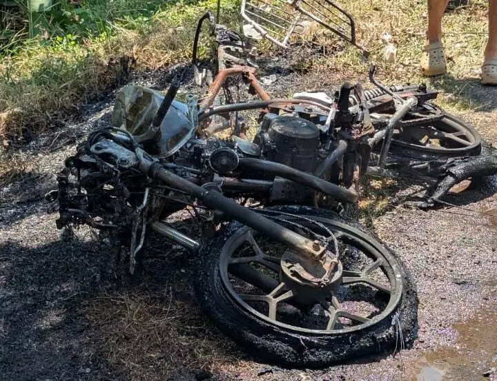 ರಸ್ತೆ ಪಕ್ಕದ ಕಲ್ಲಿಗೆ ಢಿಕ್ಕಿ ಹೊಡೆದು ಹೊತ್ತಿ ಉರಿದ ಬೈಕ್
