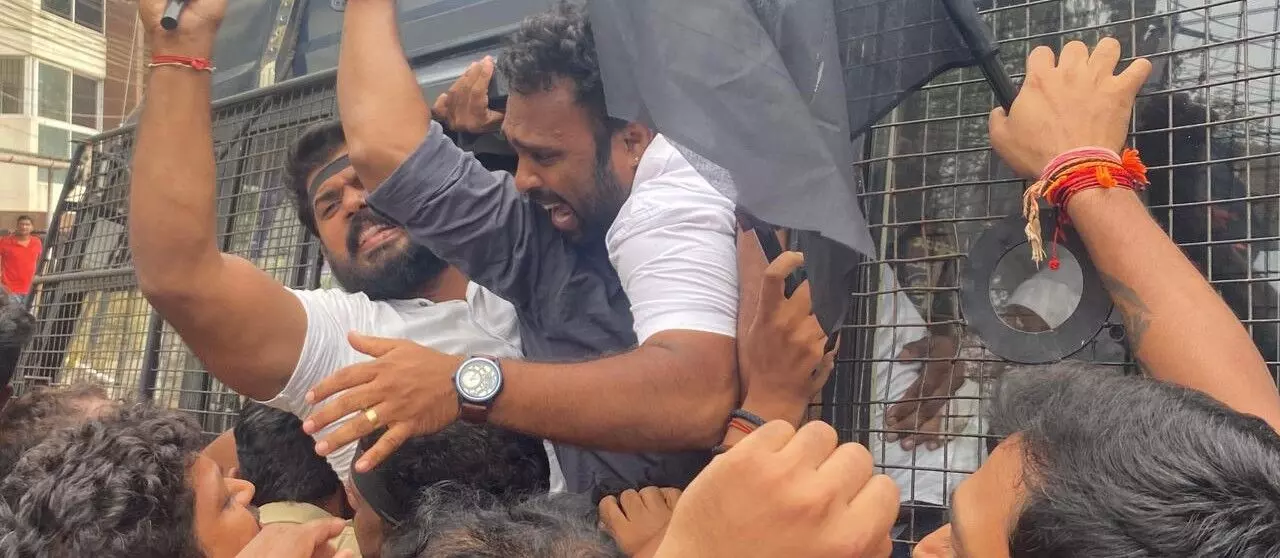 ಈ ವೇಳೆ ತಕ್ಷಣ ಕಾರ್ಯ ಪ್ರವೃತ್ತರಾದ ಪೊಲೀಸರು, ಪ್ರತಿಭಟನಾಕಾರರನ್ನು ಬಂಧಿಸಿದ್ದಾರೆ.