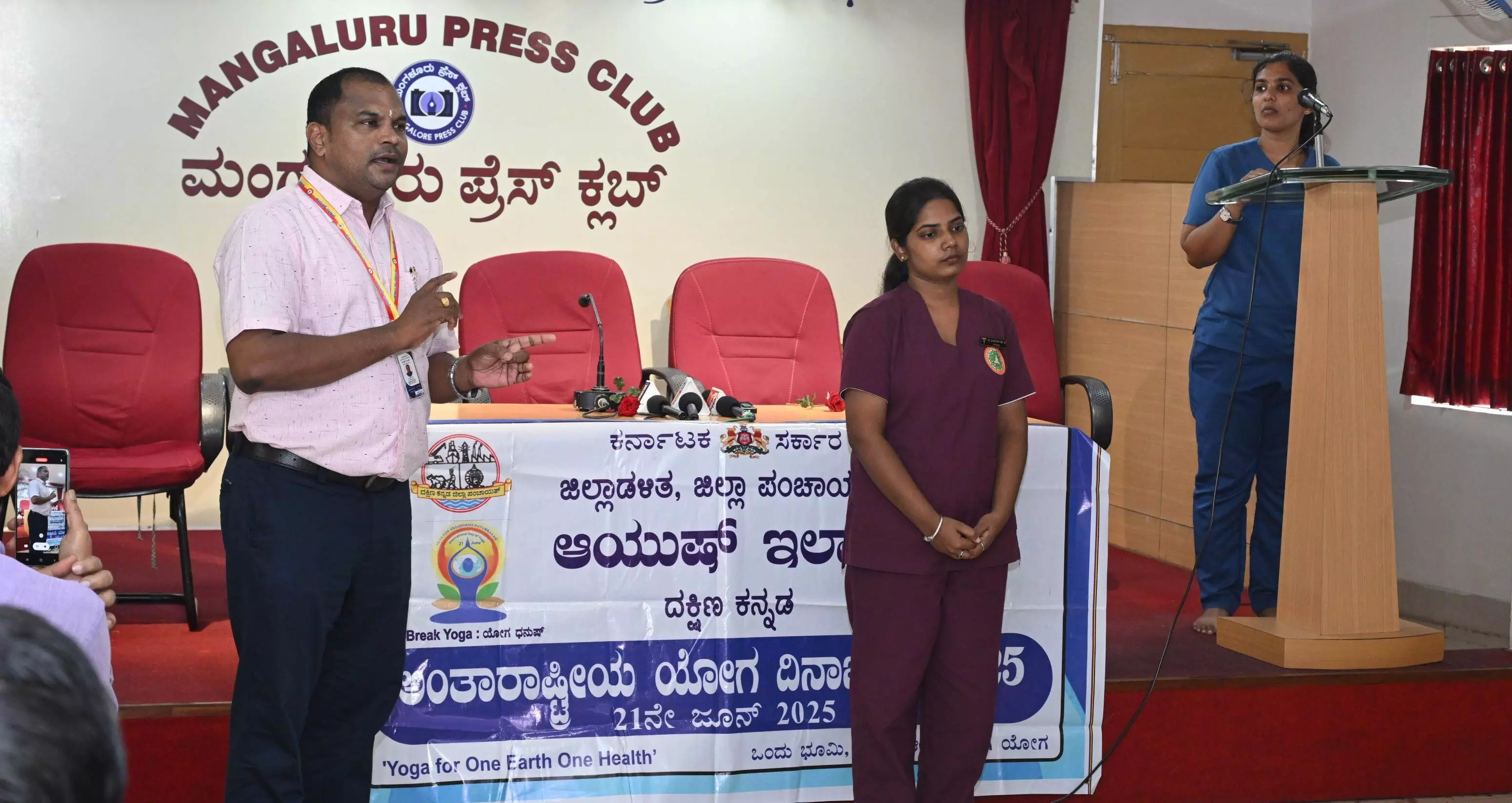 ವೆನ್ಲಾಕ್ ಆಯುಷ್ ಆಸ್ಪತ್ರೆಯ ಯೋಗ ಮತ್ತು ಪ್ರಕೃತಿ ಚಿಕಿತ್ಸೆಯ ವೈದ್ಯಾಧಿಕಾರಿ ಡಾ.ಪ್ರಕಾಶ್.ಎ.ಜೆ. ಯೋಗ ಮತ್ತು ಪ್ರಾಣಾಯಾಮದ ಬಗ್ಗೆ ಮಾಹಿತಿ ನೀಡಿದರು. ಮಂಗಳೂರು ಪ್ರೆಸ್ ಕ್ಲಬ್ ಅಧ್ಯಕ್ಷ ಪಿ.ಬಿ. ಹರೀಶ್ ರೈ ಅಧ್ಯಕ್ಷತೆ ವಹಿಸಿದ್ದರು.