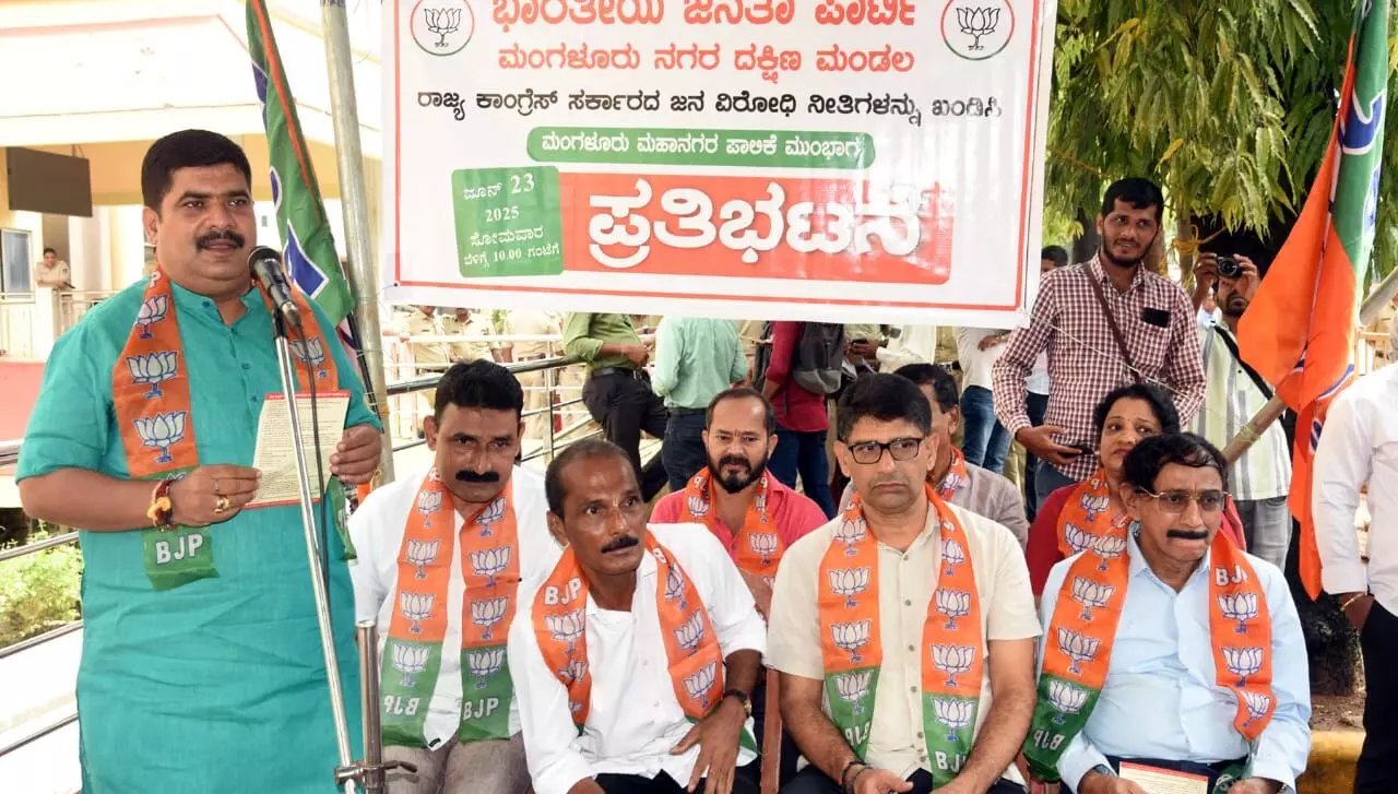 ರಾಜ್ಯ ಕಾಂಗ್ರೆಸ್ ಸರಕಾರದ ಜನವಿರೋಧಿ ನೀತಿಗಳನ್ನು ಖಂಡಿಸಿ ಬಿಜೆಪಿ ಮಂಗಳೂರು ನಗರ ದಕ್ಷಿಣ ಮಂಡಲದ ವತಿಯಿಂದ ಮಂಗಳೂರು ಮಹಾನಗರ ಪಾಲಿಕೆ ಕಚೇರಿಯ ಮುಂದೆ ಸೋಮವಾರ ನಡೆದ ಪ್ರತಿಭಟನೆಯಲ್ಲಿ ಅವರು ಮಾತನಾಡಿದರು.