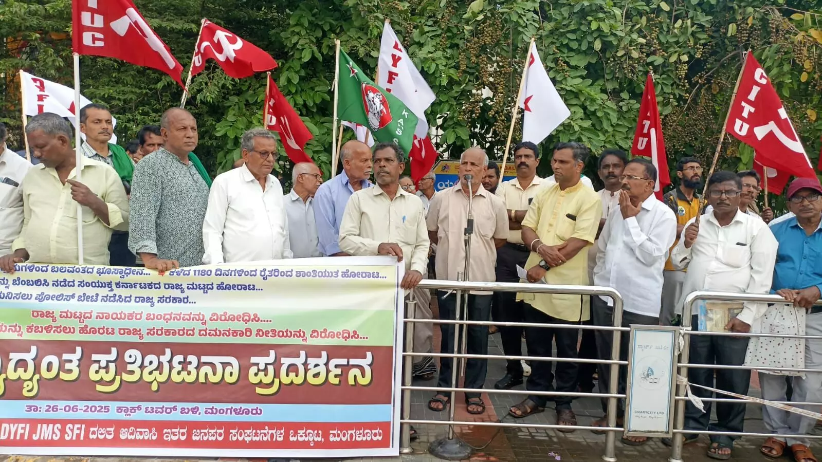 ಮಂಗಳೂರು: ಬೆಂಗಳೂರು ಗ್ರಾಮಾಂತರ ಜಿಲ್ಲೆಯ ದೇವನಹಳ್ಳಿ ತಾಲೂಕಿನ ಚೆನ್ನರಾಯಪಟ್ಟಣದ 13 ಗ್ರಾಮಗಳ ರೈತರ ಭೂಮಿಯನ್ನು ಬಲವಂತವಾಗಿ ಸ್ವಾಧೀನಪಡಿಸಿರುವುದರ ವಿರುದ್ಧ ನಡೆಯುತ್ತಿರುವ ಹೋರಾಟವನ್ನು ಹತ್ತಿಕ್ಕಲು ರಾಜ್ಯ ಸರಕಾರವು ರೈತ ಕಾರ್ಮಿಕ ನಾಯಕರನ್ನು ಬಂಧಿಸಿರುವುದನ್ನು ಖಂಡಿಸಿ ಗುರುವಾರ ರಾಜ್ಯಾದ್ಯಂತ ನಡೆದ ಪ್ರತಿಭಟನೆಗೆ ಪೂರಕವಾಗಿ ನಗರದ ಕ್ಲಾಕ್ ಟವರ್ ಬಳಿ ಸಮಾನ ಮನಸ್ಕ ಸಂಘಟನೆಗಳ ಜಂಟಿ ನೇತೃತ್ವದಲ್ಲಿ ಪ್ರತಿಭಟನೆ ನಡೆಸಲಾಯಿತು.
