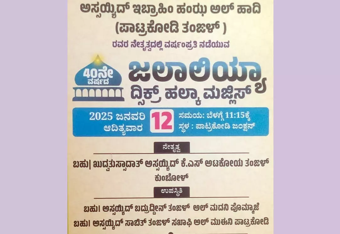 ಬಂಟ್ವಾಳ: ಅಸ್ಸೈಯದ್ ಇಬ್ರಾಹೀ ಅಲ್ ಹಾದಿ (ಪಾಟ್ರಕೋಡಿ) ತಂಙಳ್ ನೇತೃತ್ವದಲ್ಲಿ ವರ್ಷಂಪ್ರತಿ ನಡೆಯುವ 40ನೇ ವರ್ಷದ ಜಲಾಲಿಯ್ಯಾ ದ್ಸಿಕ್ರ್ ಹಲ್ಕಾ ಮಜ್ಲಿಸ್ ಜಿ.12ರಂದು ಪಾಟ್ರಕೋಡಿ ಜಂಕ್ಷನ್ ನಲ್ಲಿ ನಡೆಯಲಿದೆ.