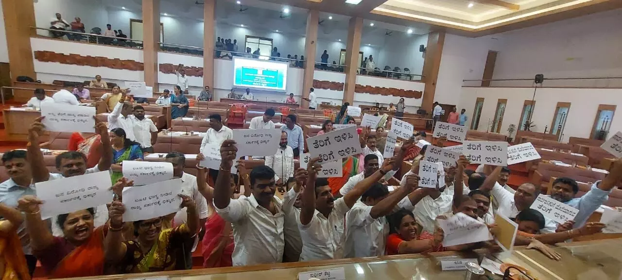 ಈ ಸಂದರ್ಭ ಪ್ರತಿಪಕ್ಷವಾದ ಕಾಂಗ್ರೆಸ್ನ ಸದಸ್ಯರು ಕೈಯ್ಯಲ್ಲಿ ‘ತೆರಿಗೆ ಇಳಿಸಿ’, ‘ಸಾರ್ವಜನಿಕರಿಗೆ ಹೊರೆಯಾಗುವ ತೆರಿಗೆ ಇಳಿಸಿ’ ಎಂಬ ಭಿತ್ತಿಪತ್ರಗಳನ್ನು ಹಿಡಿದು ಮೇಯರ್ ಪೀಠದೆದುರು ತೆರಳಿ ಘೋಷಣೆ ಕೂಗಿದರು. ಬಿಜೆಪಿ ಸದಸ್ಯರನೇಕರು ಈ ಸಂದರ್ಭ ಕಾಂಗ್ರೆಸ್ ಸದಸ್ಯರು ರಾಜಕೀಯ ಮಾಡುತ್ತಿದ್ದಾರೆಂದು ತಮ್ಮ ಆಸನದ ಮೈಕ್ಗಳಲ್ಲಿ ಆಕ್ರೋಶ ವ್ಯಕ್ತಪಡಿಸಿದರು. ಈ ಸಂದರ್ಭ ಪರಸ್ಪರ ಸದಸ್ಯರು ಪಕ್ಷಗಳ ವಿರುದ್ಧ ಘೋಷಣೆಗಳನ್ನು ಕೂಗಲಾರಂಭಿಸಿದರು. ಗದ್ದಲ ವಾತಾವರಣದ ನಡುವೆ, ಸಭೆ ನಿಯಂತ್ರಿಸಲಾಗದೆ, ಲಾಂಗ್ ಬೆಲ್ ಪ್ರೆಸ್ ಮಾಡಿ ಮೇಯರ್ ಏನೂ ಹೇಳದೆ ಸದನದಿಂದ ಹೊರ ನಡೆದರು.