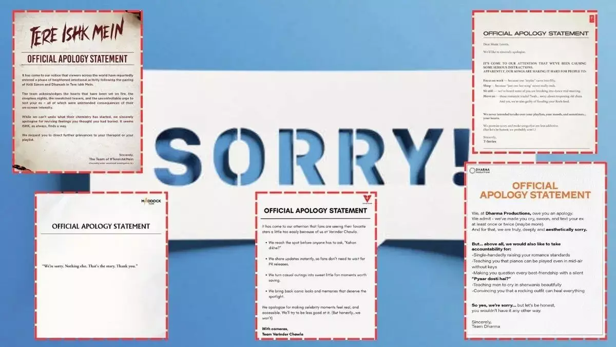 ಬೆಂಗಳೂರು: ಸಾಮಾಜಿಕ ಮಾಧ್ಯಮದಲ್ಲಿ ಇತ್ತೀಚೆಗೆ ಅಧಿಕೃತ ಕ್ಷಮೆಯಾಚನೆಯ ಪ್ರವೃತ್ತಿ ವೈರಲ್ ಆಗಿದೆ. ಬಾಲಿವುಡ್ ನ ಪ್ರಮುಖ ನಿರ್ಮಾಣ ಸಂಸ್ಥೆಗಳಾದ ಧರ್ಮ ಪ್ರೊಡಕ್ಷನ್ಸ್, ಮ್ಯಾಡಾಕ್ ಫಿಲ್ಮ್ಸ್, ಟಿ–ಸೀರೀಸ್ ಸೇರಿದಂತೆ ನಟ ಧನುಷ್ ಮತ್ತು ಕೃತಿ ಸನೋನ್ ಅಭಿನಯದ ‘ತೇರೆ ಇಷ್ಕ್ ಮೇ’ ಚಿತ್ರದ ತಂಡವೂ ಈ ಟ್ರೆಂಡ್ನಲ್ಲಿ ಪಾಲ್ಗೊಂಡಿದೆ.