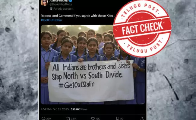 ಫೆಬ್ರವರಿ 21, 2025ರಂದು ಎಕ್ಸ್ ಖಾತೆದಾರರೊಬ್ಬರು ವಿದ್ಯಾರ್ಥಿಗಳು ʼALL Indians are Brothers and Sisters. Stop Noth vs South divide #GetOutStalinʼ ಎಂಬ ಬ್ಯಾನರ್ನ್ನು ಹಿಡಿದಿರುವ ಚಿತ್ರವೊಂದನ್ನು ಹಂಚಿಕೊಂಡಿದ್ದಾರೆ. ಈ ಚಿತ್ರಕ್ಕೆ ಶೀರ್ಷಿಕೆಯಾಗಿ ʼRepost and Comment if you agree with these Kids. #GetOutStalinʼ ಎಂದು ಬರೆದು ಪೊಸ್ಟ್ ಮಾಡಿರುವುದನ್ನು ನೋಡಬಹುದು.