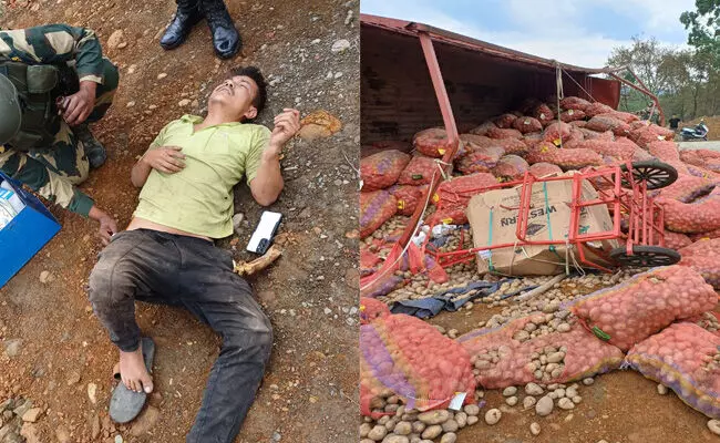 ಶುಕ್ರವಾರ ಅಪರಾಹ್ನ ಆಲೂಗಡ್ಡೆಗಳನ್ನು ಸಾಗಿಸುತ್ತಿದ್ದ ಲಾರಿಯೊಂದು ರಾಷ್ಟ್ರೀಯ ಹೆದ್ದಾರಿ 2ರಲ್ಲಿ ಕುಕಿ ಪ್ರಾಬಲ್ಯದ ಪ್ರದೇಶವಾಗಿರುವ ಕೀಥೇಲ್ ಮಾನ್ಬಿ ಮಿಲಿಟರಿ ಕಾಲನಿಯ ಬಳಿ ಪಲ್ಟಿಯಾಗಿತ್ತು. ಚಾಲಕ ಹೇಮಾಮ್ ಪ್ರೇಮ್ ಸಿಂಗ್(36) ಗಂಭೀರವಾಗಿ ಗಾಯಗೊಂಡಿದ್ದು,ಆತನ ಬಲಗಿವಿಯಿಂದ ರಕ್ತಸ್ರಾವವಾಗುತ್ತಿತ್ತು.
