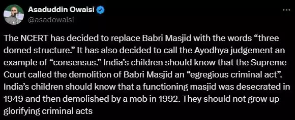 "ಎನ್ಸಿಇಆರ್ಟಿಯು ಬಾಬರಿ ಮಸೀದಿಯನ್ನು 'ಮೂರು ಗುಮ್ಮಟಗಳ ರಚನೆ' ಎಂಬ ಪದಗಳೊಂದಿಗೆ ಬದಲಾಯಿಸಲು ನಿರ್ಧರಿಸಿದೆ. ಅಯೋಧ್ಯೆಯ ತೀರ್ಪನ್ನು 'ಒಮ್ಮತದ' ಉದಾಹರಣೆ ಎಂದು ಕರೆಯಲು ನಿರ್ಧರಿಸಿದೆ. ಇದು ಅತಿರೇಕದ ಅಪರಾಧ ಕೃತ್ಯ" ಎಂದು ಒವೈಸಿ ಎಕ್ಸ್ ನಲ್ಲಿ ಪೋಸ್ಟ್ ಮಾಡಿದ್ದಾರೆ.