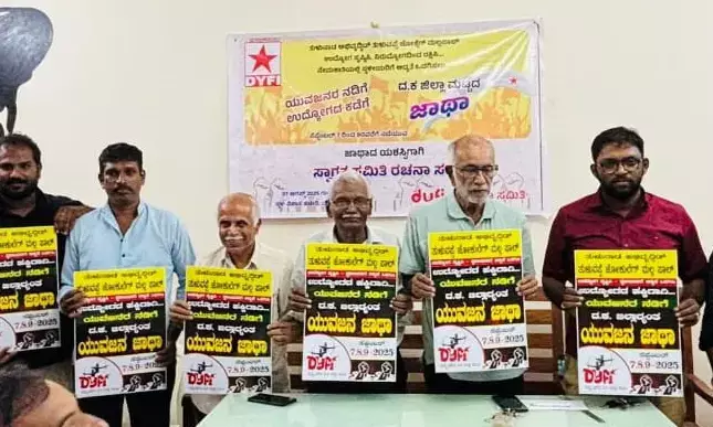 ಮಂಗಳೂರು: 'ತುಳುನಾಡ ಅಭಿವೃದ್ಧಿಡ್ ತುಳುವಪ್ಪೆ ಜೋಕ್ಲೆಗ್ ಮಲ್ಲ ಪಾಲ್' ಎಂಬ ಘೋಷಣೆಯಡಿ ಉದ್ಯೋಗ ಸೃಷ್ಟಿಸಿ, ಸ್ಥಳೀಯರಿಗೆ ಆದ್ಯತೆ ಒದಗಿಸಲು ಹಾಗೂ ಸರೋಜಿನಿ ಮಹಿಷಿ ವರದಿಯ ಶಿಫಾರಸುಗಳನ್ನು ಜಾರಿಗೆ ತರಲು ಆಗ್ರಹಿಸಿ ಸೆಪ್ಟಂಬರ್ 7, 8, 9 ಮೂರು ದಿನಗಳ ಕಾಲ ದಕ್ಷಿಣ ಕನ್ನಡ ಜಿಲ್ಲಾದ್ಯಂತ ಯುವಜನರ ಜಾಥಾ ಸಂಘಟಿಸಲು ಡಿವೈಎಫ್ಐ ದ.ಕ. ಜಿಲ್ಲಾ ಸಮಿತಿ ನಿರ್ಧರಿಸಿದೆ. ಈ ಜಾಥಾದ ಯಶಸ್ವಿಗಾಗಿ ಆ.7ರಂದು ನಗರದ ವಿಕಾಸ ಕಚೇರಿಯಲ್ಲಿ ಸ್ವಾಗತ ಸಮಿತಿ ರಚನಾ ಸಭೆ ನಡೆಯಿತು.