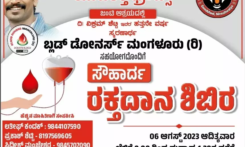 ಅಂದು ಬೆಳಗ್ಗೆ 9ರಿಂದ ಮಧ್ಯಾಹ್ನ 1.30ರವರೆಗೆ ಕಂದಕ್ ನೀರೇಶ್ವಾಲ್ಯದ ಸರಕಾರಿ ಹಿ.ಪ್ರಾ.ಶಾಲೆಯಲ್ಲಿ ಸೌಹಾರ್ದ ರಕ್ತದಾನ ಶಿಬಿರವು ನಡೆಯಲಿದೆ ಎಂದು ಪ್ರಕಟನೆ ತಿಳಿಸಿದೆ.