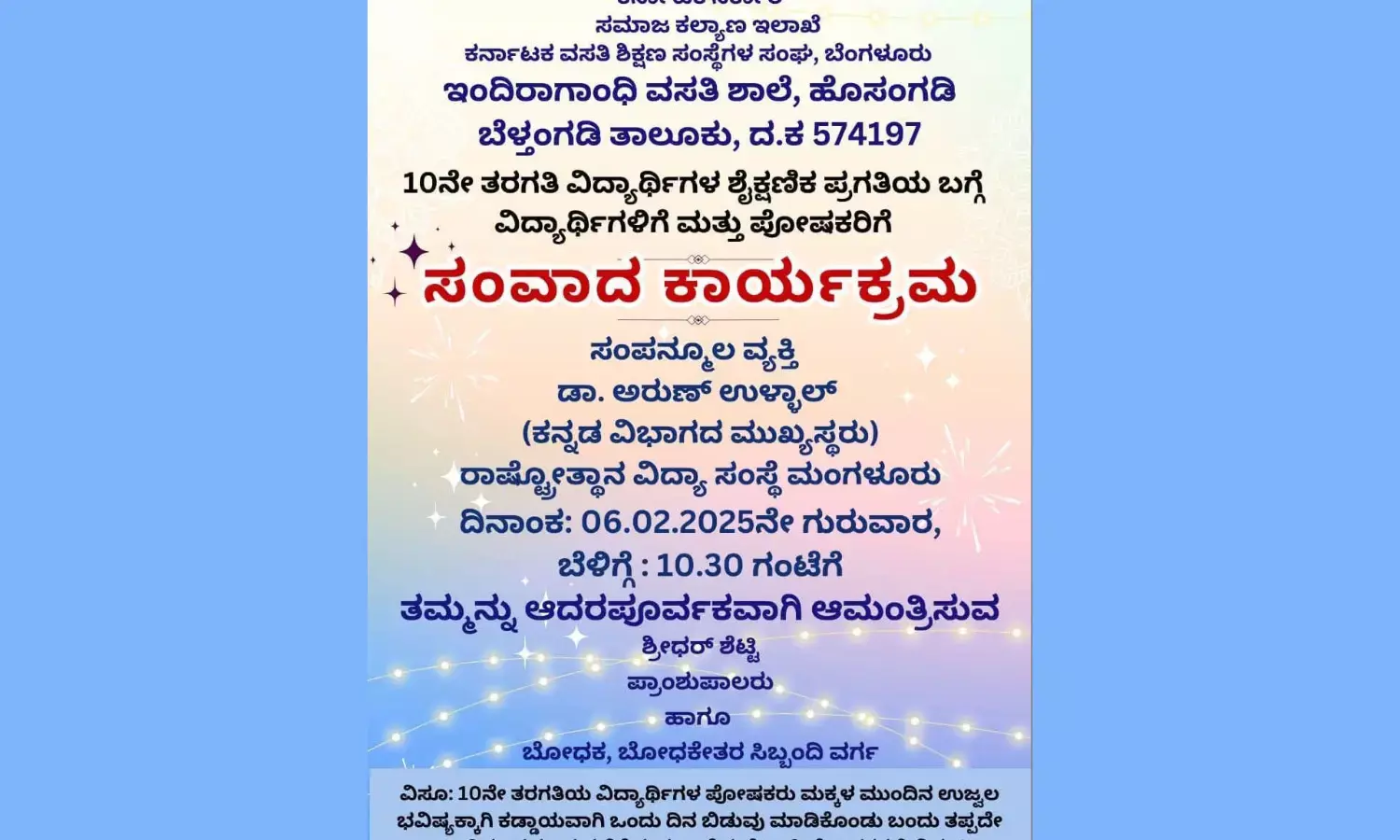 ಬೆಳ್ತಂಗಡಿ ತಾಲೂಕಿನ ಹೊಸಂಗಡಿಯಲ್ಲಿರುವ ಸಮಾಜ ಕಲ್ಯಾಣ ಇಲಾಖೆಯ ವ್ಯಾಪ್ತಿಗೊಳಪಟ್ಟ ಇಂದಿರಾ ಗಾಂಧಿ ಸರಕಾರಿ ವಸತಿ ಶಾಲೆಯಲ್ಲಿ ಎಸೆಸೆಲ್ಸಿ ವಿದ್ಯಾರ್ಥಿಗಳಿಗೆ ಮತ್ತು ಪೋಷಕರಿಗಾಗಿ ಗುರುವಾರ(ಫೆ.6) ಬೆಳಗ್ಗೆ ಸಂವಾದ ಕಾರ್ಯಕ್ರಮವೊಂದನ್ನು ಆಯೋಜಿಸಲಾಗಿತ್ತು. ಸಂಪನ್ಮೂಲ ವ್ಯಕ್ತಿಯಾಗಿ ಮಂಗಳೂರಿನ ಖಾಸಗಿ ವಿದ್ಯಾಸಂಸ್ಥೆಯೊಂದರ ಶಿಕ್ಷಕ ಡಾ.ಅರುಣ್ ಉಳ್ಳಾಲ್ ಎಂಬವರನ್ನು ಕರೆಯಲಾಗಿತ್ತು.