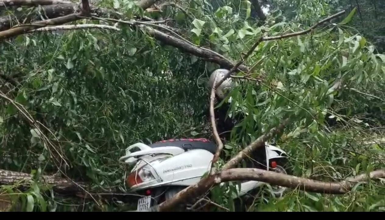 ದೊಡ್ಡ ಮರವೇ ಸ್ಕೂಟರ್ ಮೇಲೆ ಬಿದ್ದಿದ್ದು ಅದೃಷ್ಟವಶಾತ್ ಇಬ್ಬರೂ ಅಪಾಯದಿಂದ ಪಾರಾಗಿದ್ದಾರೆ