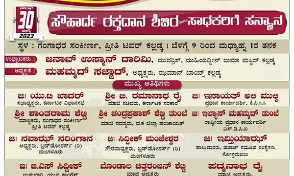 ಬಂಟ್ವಾಳ : ಕಲ್ಲಡ್ಕ ಝಮಾನ್ ಬಾಯ್ಸ್ ಇದರ ಆಶ್ರಯದಲ್ಲಿ ಬ್ಲಡ್ ಡೋನರ್ಸ್ ಮಂಗಳೂರು ಹಾಗೂ ಫಾದರ್ ಮುಲ್ಲರ್ ಆಸ್ಪತ್ರೆ ಮಂಗಳೂರು ಇವುಗಳ ಸಹಕಾರದೊಂದಿಗೆ ಮರ್ಹೂಂ ಬಿ.ಕೆ ಇದ್ದಿನಬ್ಬ ಸ್ಮರಣಾರ್ಥ ಸೌಹಾರ್ದ ರಕ್ತದಾನ ಶಿಬಿರ ಹಾಗೂ ಸಾಧಕರಿಗೆ ಸನ್ಮಾನ ಕಾರ್ಯಕ್ರಮವು ಜುಲೈ 30 ರಂದು ಕಲ್ಲಡ್ಕದ ಗಂಗಾಧರ ಸಂಕೀರ್ಣದಲ್ಲಿ ನಡೆಯಲಿದೆ.