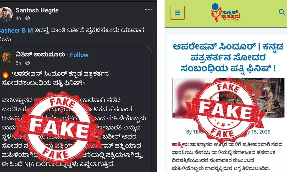 ನಿತಿನ್ ಶಾಮನೂರು ಎಂಬಾತನ ಫೇಸ್ ಬುಕ್ ಪೋಸ್ಟ್ ನಲ್ಲಿ 'ಆಪರೇಷನ್ ಸಿಂದೂರ್' : ಕನ್ನಡ ಪತ್ರಕರ್ತನ ಸೋದರ ಸಂಬಂಧಿಯ ಪತ್ನಿ ಫಿನಿಷ್' ಎಂಬ ಶೀರ್ಷಿಕೆಯಡಿ ಒಬ್ಬ ಮಹಿಳೆಯ ಫೋಟೋ ಹಾಗೂ ಸೈನಿಕರ ಫೋಟೋ ಜೊತೆ ಸುಳ್ಳು ಮಾಹಿತಿ ಬರೆಯಲಾಗಿದೆ. ಇದೇ ಫೇಸ್ ಬುಕ್ ಪೋಸ್ಟ್ ಅನ್ನು ಸಂತೋಷ್ ಹೆಗಡೆ ಎಂಬಾತನೂ ತನ್ನ ಫೇಸ್ ಬುಕ್ ಖಾತೆಯಲ್ಲಿ ಶೇರ್ ಮಾಡಿದ್ದಾನೆ. Bettampady Chandra ಎಂಬ ಹೆಸರಿನ ಫೇಸ್ ಬುಕ್ ಖಾತೆಯಿಂದಲೂ ಇದೇ ಸುಳ್ಳು ಸುದ್ದಿ ಪೋಸ್ಟ್ ಮಾಡಲಾಗಿದೆ. newsputtur.com ಎಂಬ ಹೆಸರಿನ ಒಂದು ವೆಬ್ ಸೈಟ್ ಕೂಡ ಇದೇ ಸುಳ್ಳು ಸುದ್ದಿಯನ್ನು ಹರಡಿದೆ ಎಂದು ಪೊಲೀಸ್ ದೂರಿನಲ್ಲಿ ಅವರು ಉಲ್ಲೇಖಿಸಿದ್ದಾರೆ.