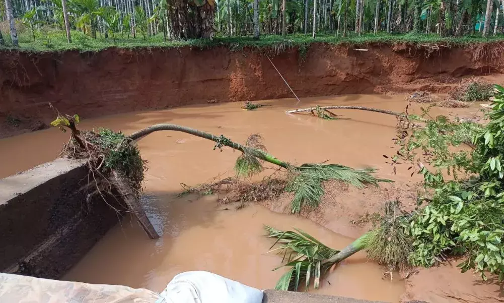 ಪೆರುವಾಜೆ ಗ್ರಾಮದ ಚೆನ್ನಾವರ ಕುಂಡಡ್ಕದಲ್ಲಿ ಶನಿವಾರ ಸುರಿದ ಭಾರೀ ಮಳೆಗೆ ಕಿಂಡಿ ಅಣೆಕಟ್ಟಿನ ಬದಿಯಲ್ಲಿರುವ ಕೃಷಿ ತೋಟ ಕೊಚ್ಚಿಹೋಗಿದೆ. ಅಣೆಕಟ್ಟಿಗೆ ನೀರು ಸಂಗ್ರಹಕ್ಕಾಗಿ ಹಲಗೆ ಹಾಕಿದ ಕಾರಣ ಮಳೆ ನೀರು ತುಂಬಿ ಇನ್ನೊಂದು ಬದಿಯಿಂದ ಕೊಚ್ಚಿ ಹೋಗಿದ್ದು ಪುತ್ತು ಚೆನ್ನಾವರ ಎಂಬವರ ತೋಟದ 100ಕ್ಕೂ ಮಿಕ್ಕಿ ಅಡಿಕೆ ಗಿಡ, ಮರಗಳು ಬಿದ್ದು ಕೊಚ್ಚಿ ಹೋಗಿದ್ದು ಅಪಾರ ನಷ್ಟ ಸಂಭವಿಸಿದೆ.