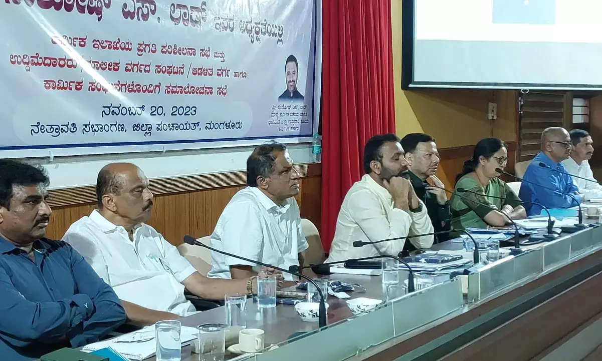 ಜಿಲ್ಲಾ ಪಂಚಾಯತ್ ಸಭಾಂಗಣದಲ್ಲಿ ಸೋಮವಾರ ದಕ್ಷಿಣ ಕನ್ನಡ ಮತ್ತು ಉಡುಪಿ ಜಿಲ್ಲೆಗಳ ಕಾರ್ಮಿಕ ಇಲಾಖಾ ಪ್ರಗತಿ ಪರಿಶೀಲನೆ ನಡೆಸಿ ಮಾತನಾಡುತ್ತಿದ್ದರು.