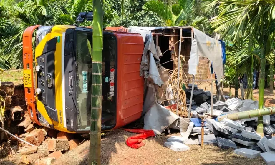 ಮುಳ್ಯದ ಯತೀಶ್ ಅವರ ಹೊಸ ಮನೆಯ ಅಂಗಳಕ್ಕೆ ಇಂಟರ್ ಲಾಕ್ ಅಳವಡಿಸಲು ಇಂಟರ್ ಲಾಕ್ ತುಂಬಿಕೊಂಡು ಬರುತ್ತಿದ್ದ ಲಾರಿ ಪಲ್ಟಿಯಾಗಿದೆ.