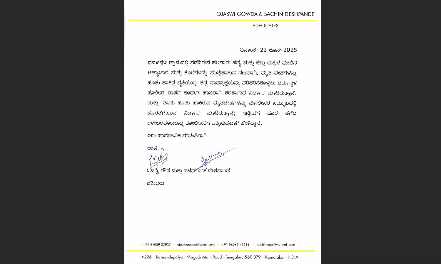 ಬೆಂಗಳೂರಿನ ವಕೀಲರಾದ ಓಜಸ್ವಿ ಗೌಡ ಮತ್ತು ಸಚಿನ್ ಎಸ್. ದೇಶಪಾಂಡೆ ಎಂಬವರ ಹೆಸರಿನಲ್ಲಿರುವ ಪತ್ರದಲ್ಲಿ, "ಧರ್ಮಸ್ಥಳ ಗ್ರಾಮದಲ್ಲಿ ನಡೆದಿರುವ ಹಲವಾರು ಹತ್ಯೆ ಮತ್ತು ಹೆಣ್ಣು ಮಕ್ಕಳ ಮೇಲಿನ ಅತ್ಯಾಚಾರ ಮತ್ತು ಕೊಲೆಗಳನ್ನು ಮುಚ್ಚಿಹಾಕುವ ಸಲುವಾಗಿ, ಮೃತದೇಹಗಳನ್ನು ಹೂತು ಹಾಕಿದ್ದ ವ್ಯಕ್ತಿಯೊಬ್ಬ ತನ್ನ ಪಾಪಪ್ರಜ್ಞೆಯನ್ನು ಪರಿಹರಿಸಿಕೊಳ್ಳಲು ಧರ್ಮಸ್ಥಳ ಪೊಲೀಸ್ ಠಾಣೆಗೆ ಕೂಡಲೇ ಹಾಜರಾಗಿ ಶರಣಾಗುವ ನಿರ್ಧಾರ ಮಾಡಿರುತ್ತಾನೆ. ಮತ್ತು ತಾನು ಹೂತು ಹಾಕಿರುವ ಮೃತದೇಹಗಳನ್ನು ಪೋಲೀಸರ ಸಮ್ಮುಖದಲ್ಲಿ ಹೊರತೆಗೆಯುವ ನಿರ್ಧಾರ ಮಾಡಿರುತ್ತಾನೆ. ಇತ್ತೀಚೆಗೆ ಹೊರತೆಗೆದ ಕಳೇಬರವೊಂದುನ್ನು ಪೋಲೀಸರಿಗೆ ಒಪ್ಪಿಸುವುದಾಗಿ ಹೇಳಿದ್ದಾನೆ" ಎಂದು ಉಲ್ಲೇಖಿಸಲಾಗಿದೆ.
