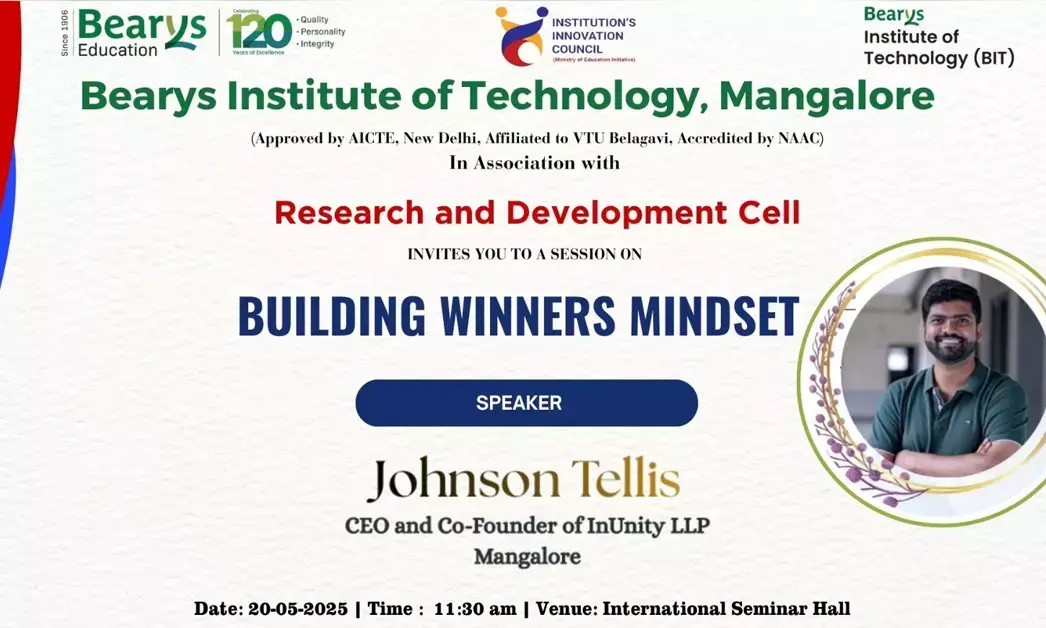 ಮಂಗಳೂರು: ಬ್ಯಾರೀಸ್ ಇನ್ಸ್ಟಿಟ್ಯೂಟ್ ಆಫ್ ಟೆಕ್ನಾಲಜಿ (ಬಿಐಟಿ)ಯಲ್ಲಿ ಇನ್ಸ್ಟಿಟ್ಯೂಟ್ ಆಫ್ ರಿಸರ್ಚ್ ಆಂಡ್ ಡೆವೆಲಪ್ಮೆಂಟ್ ಸೆಲ್, ಡಿಪಾರ್ಟ್ಮೆಂಟ್ ಆಫ್ ಬೇಸಿಕ್ ಸೈನ್ಸ್ ಜಂಟಿಯಾಗಿ ಶುಕ್ರವಾರ ಪ್ರಥಮ ವರ್ಷದ ಎಂಜಿನಿಯರಿಂಗ್ ವಿದ್ಯಾರ್ಥಿಗಳಿಗೆ ʼಬಿಲ್ಡಿಂಗ್ ವಿನ್ನಿಂಗ್ ಮೈಂಡ್ಸೆಟ್ʼ ಸ್ಪೂರ್ತಿದಾಯಕ ಕಾರ್ಯಕ್ರಮ ಆಯೋಜಿಸಲಾಗಿತ್ತು .