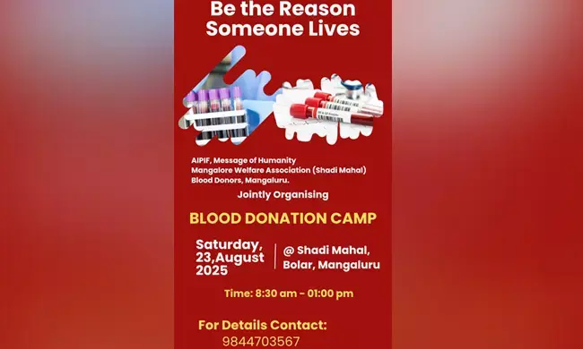 ಮಂಗಳೂರು | ಆ.23ರಂದು ಮೆಸೇಜ್ ಆಫ್ ಹ್ಯೂಮ್ಯಾನಿಟಿ ಫೋರಮ್ ವತಿಯಿಂದ ರಕ್ತದಾನ ಶಿಬಿರ