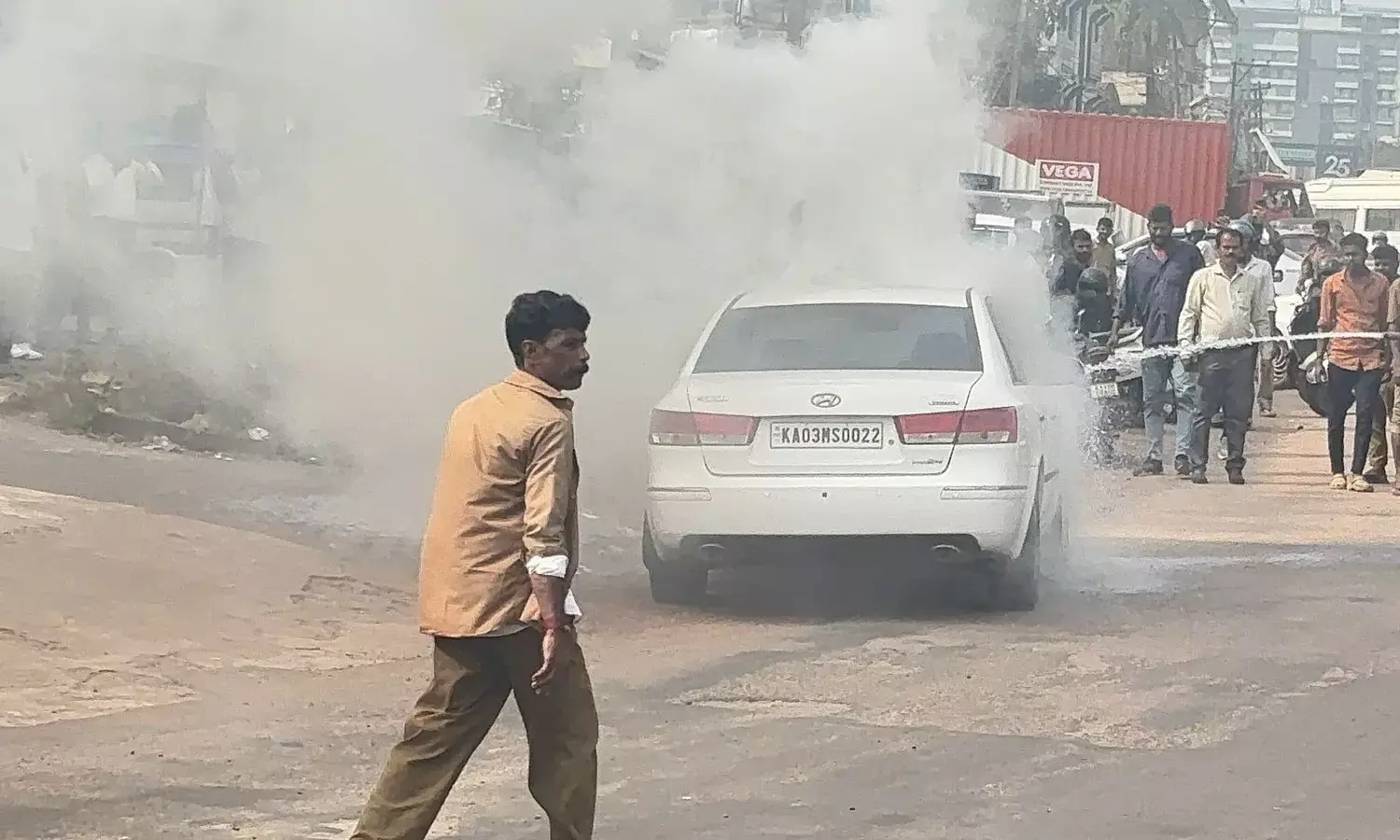 ಬಿಳಿ ಬಣ್ಣದ ಹುಂಡೈ ವೆರ್ನ ಕಾರಿನಲ್ಲಿ ದಾರಿ ಮಧ್ಯೆ ಬೆಂಕಿ ಕಾಣಿಸಿಕೊಂಡು ಹೊತ್ತಿ ಉರಿದ ಘಟನೆ ನಡೆದಿದೆ. ಪಾಲಿಕೆ ನೀರು ಸರಬರಾಜು ಟ್ಯಾಂಕರ್ ಸ್ಥಳಕ್ಕೆ ಆಗಮಿಸಿದ್ದು. ಟ್ಯಾಂಕರ್ ಸಿಬ್ಬಂದಿ ನೀರು ಹಾಯಿಸುವ ಮೂಲಕ ಕಾರಿನಲ್ಲಿ ಉಂಟಾದ ಬೆಂಕಿ ನಂದಿಸಲು ಪ್ರಯತ್ನಿಸುತ್ತಿದ್ದಾರೆ.