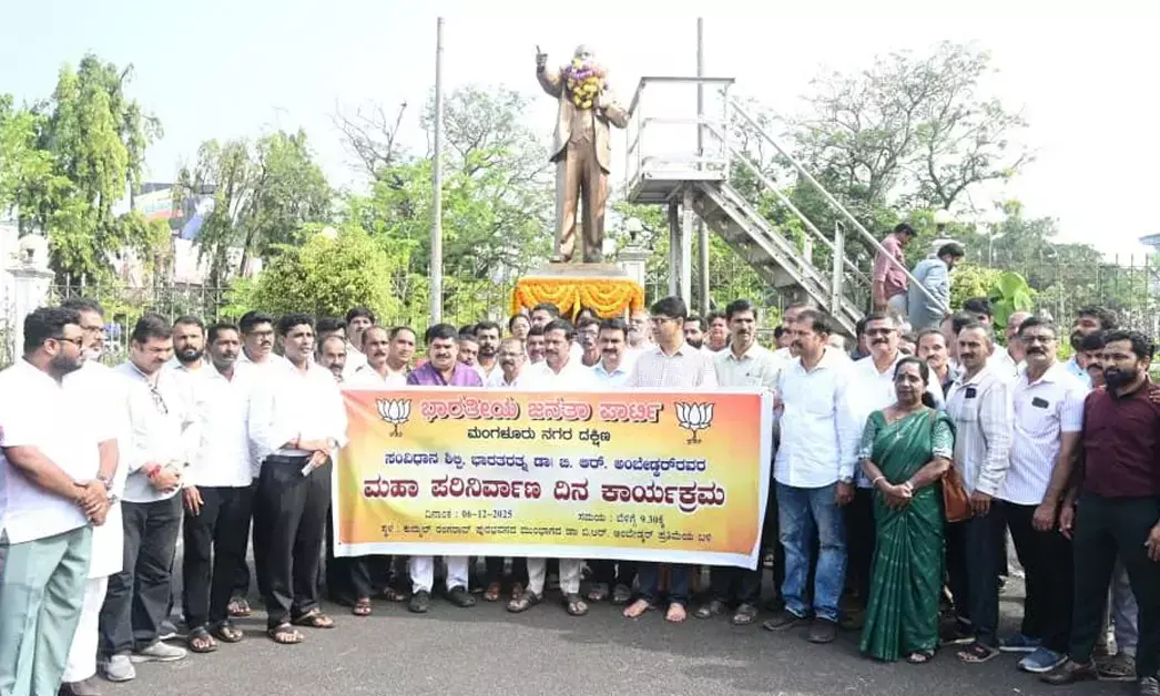 ಮಂಗಳೂರು, ಡಿ.6: ಸಂವಿಧಾನ ಶಿಲ್ಪಿ, ಭಾರತ ರತ್ನ ಡಾ.ಬಿ.ಆರ್. ಅಂಬೇಡ್ಕರ್ ಅವರ ಮಹಾ ಪರಿನಿರ್ವಾಣ ದಿನದಂದು ಬಿಜೆಪಿ ಮಂಗಳೂರು ನಗರದ ದಕ್ಷಿಣ ಮಂಡಲದ ಎಸ್ಸಿ ಮೋರ್ಚಾ ವತಿಯಿಂದ ನಗರದ ಕುದ್ಮುಲ್ ರಂಗರಾವ್ ಪುರಭವನದ ಮುಂಭಾಗದಲ್ಲಿರುವ ಅಂಬೇಡ್ಕರ್ ಪ್ರತಿಮೆಗೆ ಗೌರವಪೂರ್ವಕ ಪುಷ್ಪ ನಮನಗಳನ್ನು ಸಲ್ಲಿಸಲಾಯಿತು.
