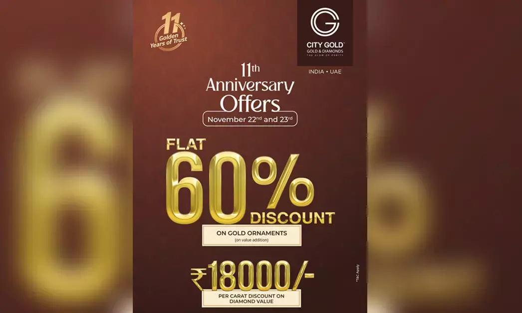 ಚಿನ್ನಾಭರಣಗಳ ತಯಾರಿಕಾ ಶುಲ್ಕದ ಮೇಲೆ ಫ್ಲಾಟ್ ಶೇ.60 ಹಾಗೂ ವಜ್ರಾಭರಣ ಖರೀದಿ ಪ್ರತೀ ಕ್ಯಾರೆಟ್ ಮೇಲೆ 18,000 ರೂ. ರಿಯಾಯಿತಿ ನೀಡಲಾಗುವುದು ಎಂದು ಸಿಟಿ ಗೋಲ್ಡ್ ಸಂಸ್ಥೆಯ ಪ್ರಕಟನೆ ತಿಳಿಸಿದೆ.