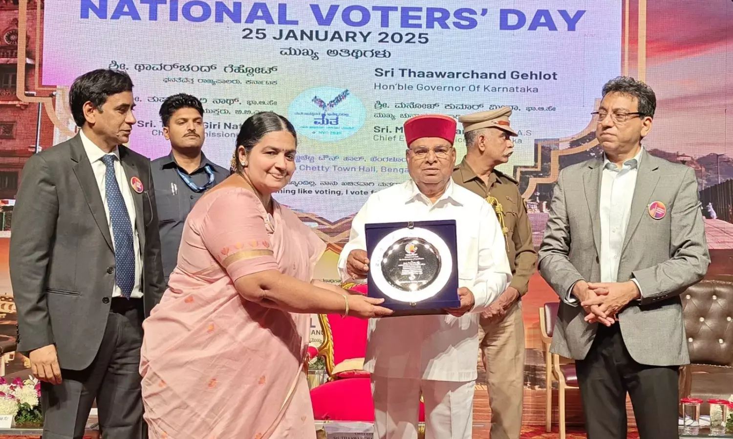ಮಂಗಳೂರು, ಜ.25: ಬೆಂಗಳೂರಿನ ಪುಟ್ಟಣ್ಣ ಚೆಟ್ಟಿ ಟೌನ್ ಹಾಲ್ನಲ್ಲಿ ಕರ್ನಾಟಕ ಮುಖ್ಯ ಚುನಾವಣಾಧಿಕಾರಿ ಆಯೋಜಿಸಿದ್ದ ರಾಷ್ಟ್ರೀಯ ಮತದಾರರ ದಿನಾಚರಣೆಯ ಸಂದರ್ಭದಲ್ಲಿ ರಾಜ್ಯಪಾಲ ಥಾವರ್ಚಂದ್ ಗೆಹ್ಲೋಟ್ ಅವರು ರಾಜ್ಯ ಮಟ್ಟದ ಮಾಸ್ಟರ್ ಟ್ರೈನರ್ (ಎಸ್ಎಲ್ಎಂಟಿ ) ಪ್ರಮೀಳಾ ರಾವ್ ಅವರಿಗೆ ಕಳೆದ ಲೋಕಸಭಾ ಚುನಾವಣೆಯ ಅತ್ಯುತ್ತಮ ಕಾರ್ಯನಿರ್ವಹಣೆಗಾಗಿ ಕರ್ನಾಟಕ ರಾಜ್ಯಪಾಲ ಥಾವರ್ಚಂದ್ ಗೆಹ್ಲೋಟ್ ಅವರು ಶನಿವಾರ ರಾಜ್ಯ ಪ್ರಶಸ್ತಿಯನ್ನು ಪ್ರದಾನ ಮಾಡಿದರು.