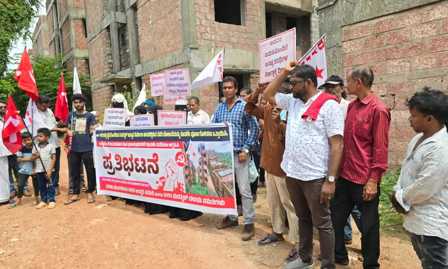 ಸುರತ್ಕಲ್ : ನಿರ್ಮಾಣ ಹಂತದಲ್ಲೇ ಸ್ಥಗಿತಗೊಂಡಿರುವ ಸುರತ್ಕಲ್ ಇಡ್ಯಾ ಗ್ರಾಮದ ಜನತಾ ಕಾಲನಿ ಯಲ್ಲಿನ ವಸತಿ ಯೋಜನೆಯನ್ನು ಕೂಡಲೇ ಪೂರ್ಣಗೊಳಿಸಿ ಅರ್ಹ ಫಲಾನುಭವಿಗಳಿಗೆ ವಿತರಿಸಬೇ ಕೆಂದು ಒತ್ತಾಯಿಸಿ ಸಿಪಿಎಂ ಮಂಗಳೂರು ನಗರ ಉತ್ತರ ಸಮಿತಿ ಹಾಗೂ ಡಿವೈಎಫ್ ಐ ಸುರತ್ಕಲ್ ವಲಯ ಸಮಿತಿಯ ನೇತೃತ್ವದಲ್ಲಿ ಫಲಾನುಭವಿಗಳು ಸೋಮವಾರ ಜನತಾಕಾಲನಿಯ ನಿರ್ಮಾಣ ಹಂತದ ವಸತಿ ಸಮುಚ್ಚಯದ ವಠಾರದಲ್ಲಿ ಪ್ರತಿಭಟನೆ ನಡೆಸಿದರು.