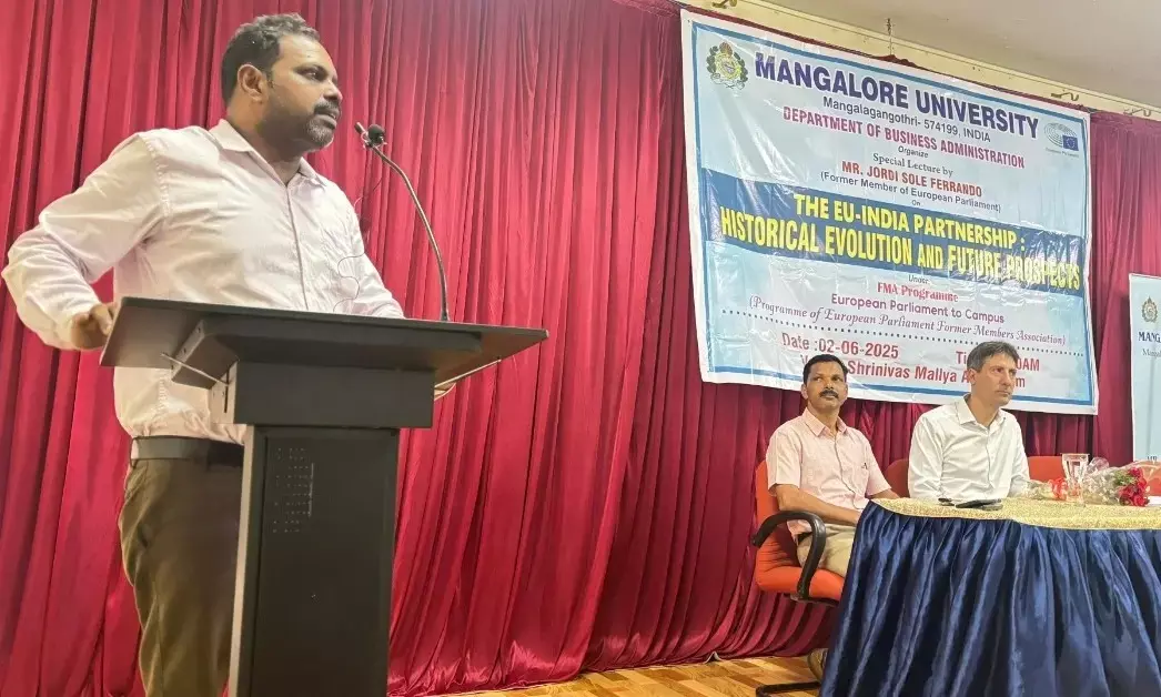 ಕೊಣಾಜೆ: ಮಂಗಳೂರು ವಿಶ್ವವಿದ್ಯಾನಿಲಯದ ವ್ಯವಹಾರ ಆಡಳಿತ ವಿಭಾಗದ ವತಿಯಿಂದ "ಯುರೋಪಿಯನ್ ಒಕ್ಕೂಟ - ಭಾರತ ಪಾಲುದಾರಿಕೆ: ಐತಿಹಾಸಿಕ ಮೌಲ್ಯಮಾಪನ ಮತ್ತು ಭವಿಷ್ಯದ ನಿರೀಕ್ಷೆಗಳು" ಎಂಬ ವಿಷಯದ ಕುರಿತು ವಿಶೇಷ ಉಪನ್ಯಾಸ ಕಾರ್ಯಕ್ರಮವು ಮಂಗಳೂರು ವಿಶ್ವವಿದ್ಯಾಲಯದ ಎಂಬಿಎ ಸಭಾಂಗಣದಲ್ಲಿ ನಡೆಯಿತು.